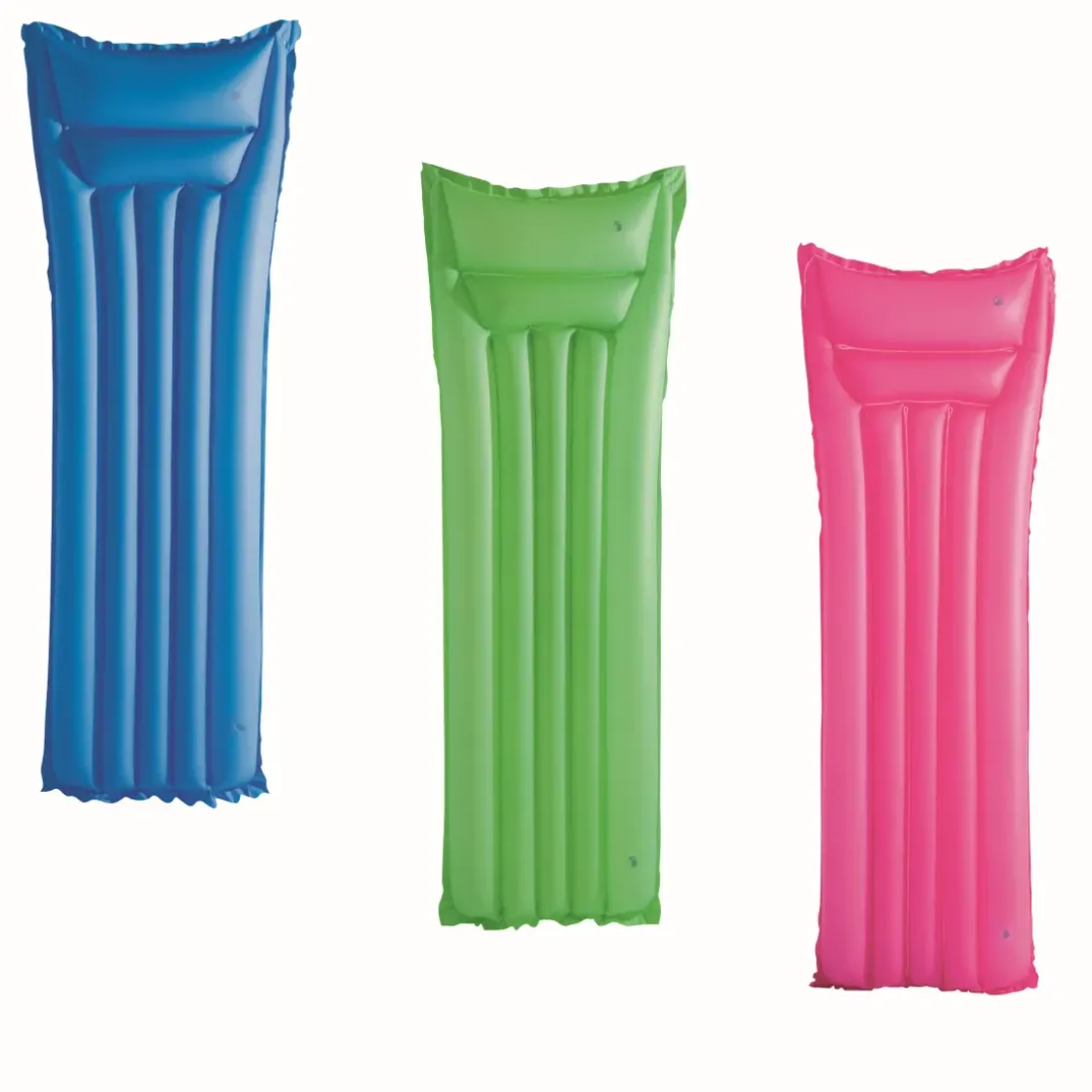 Luchtbed In Felle Unikleuren. Het Hoofdkussen Heeft Een 2 Kamer Ontwerp. Incl. Reparatie Patch. In 3 Kleuren Assorti: Roze, Groen En Blauw. Voor 1 Persoon Met Een Max. Gewicht Van 90 Kg. Van 0,18 Mm Vinyl. Afmeting: 170X54X15 Cm.