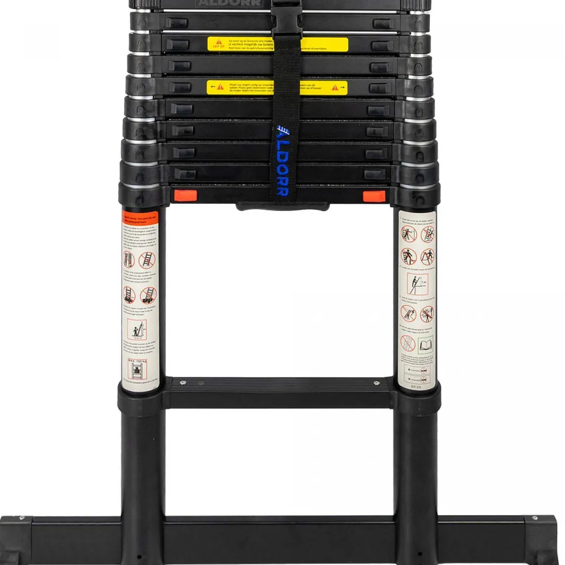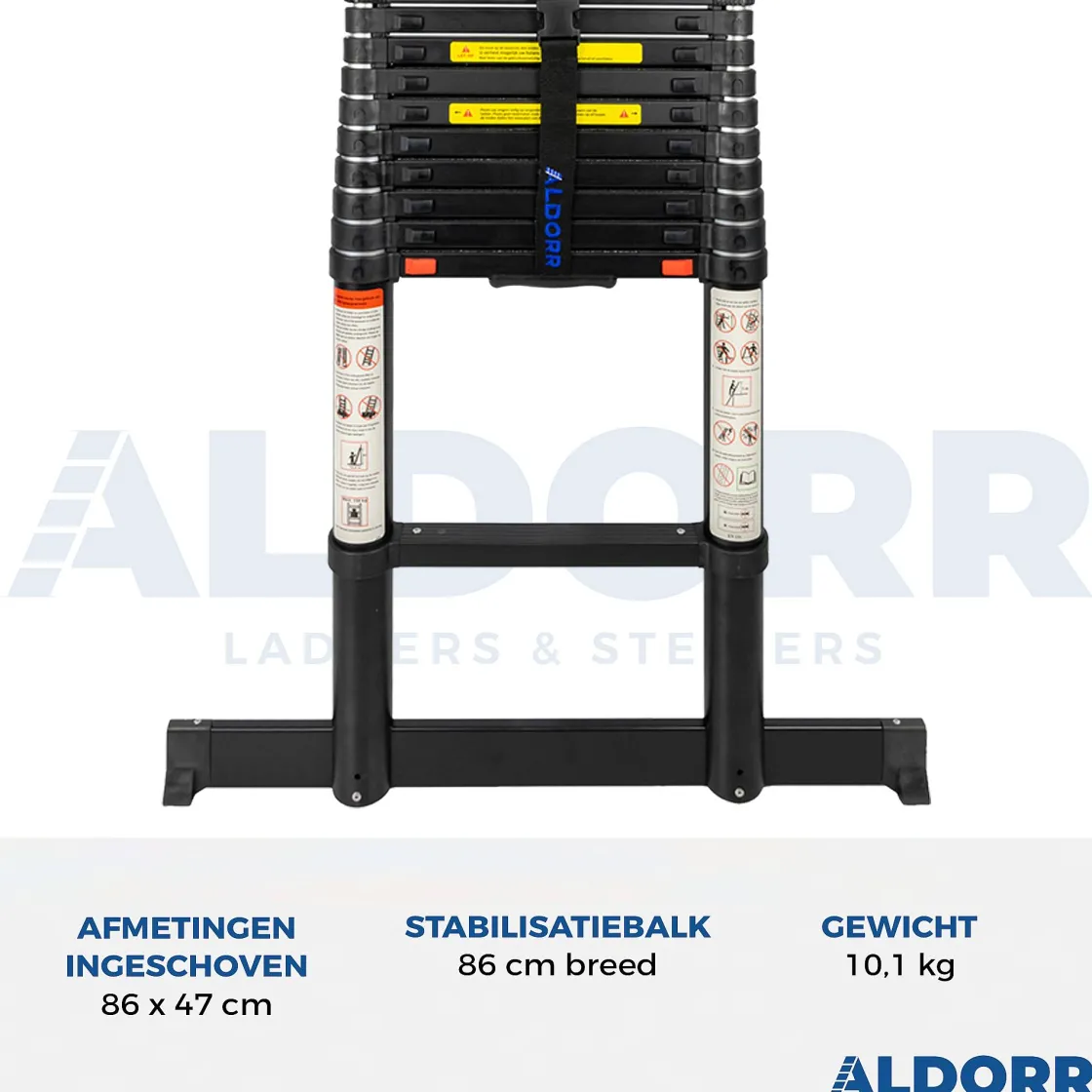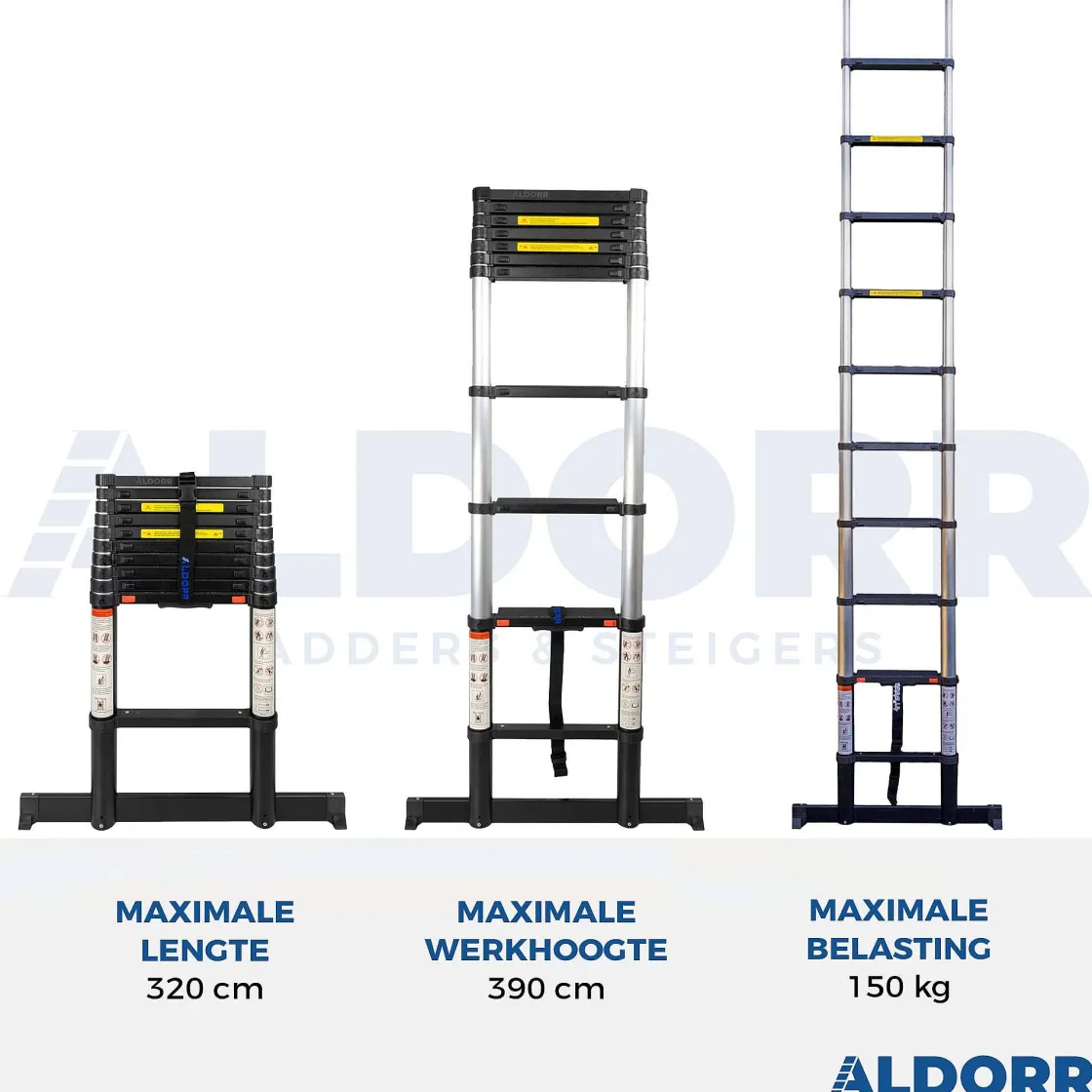 Aldorr Professional Telescopische Ladder Met Aldorr Optigrip™, Extra Brede Treden En Nieuwste Type Soft-Closingde Aldorr Professional Telescoopladders Zijn Voorzien Van Hoge Kwaliteit Aluminium En Onderscheidt Zich Door Extra Brede Treden En Aldorr Optigrip™. Daarnaast Kenmerkt Deze Professional Lijn Van Aldorr Zich Door Zwart Gecoate Onderdelen Op De Ladder. Net Als Bij De Aldor Home Telescoopladders, Kunt U Niet Alleen Op Hoogte Veilig Werken, Maar Kunt U De Telescoopladder Ook Veilig In- En Uitklappen Dankzij Het Professionele Soft Closing Systeem.Daarnaast Is De Ladder Voorzien Van Indicatoren Welke Per Trede Aangeven Of Deze Volledig Vaststaat En Veilig Is Om Te Betreden. De Telescoopladder Voldoet Zowel Aan De En 131.6 Normering Als De Nederlandse Warenwet. Met Een Ingeklapte Lengte Van Slechts 86 Cm Is De Telescoopladder Zeer Compact En Eenvoudig Te Vervoeren In Bijvoorbeeld De Kofferbak Van De Auto. Deze Ladder Is Uit Te Schuiven En Te Gebruiken Op Elke Gewenste Lengte Tussen 0,86 En 3,20 M.