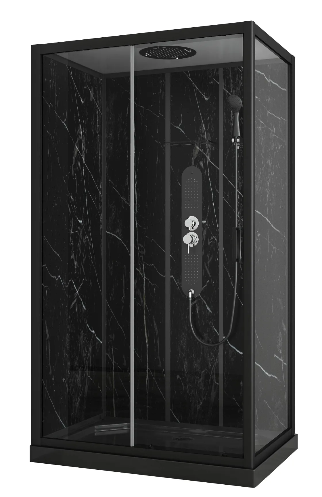 De Complete, Rechthoekige Douchecabine Alep Van Allibert 120X80 Cm Heeft Een Frontale Instap Met 1 Schuifdeur. De Stijlvolle Douchecabine In De Kleur Zwart Is Eenvoudig Te Installeren Met Een Clipsysteem Waarbij Schroeven En Boren Niet Noodzakelijk Is. De Cabine Is Siliconenvrij En Versterkt Met Transparant Glas. De Deuren Zijn Gemaakt Van 5 Mm Dikke Glas En De Achterpanelen Van 4 Mm Zwart Gemarmerd Glas. De Zeer Platte Profielen In De Kleur Zwart Zijn Gemaakt Van Aluminium En De Handgreep Van Verchroomd Abs.