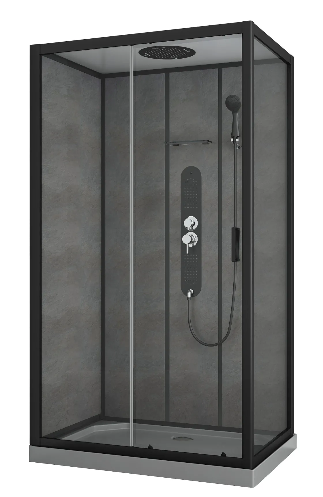 De Zwart Versterkte Acryl Douchebak Is 120X80X10 Cm En Voorzien Van Een 90 Mm Afvoer. De Totale Hoogte Bedraagt 2,25 Meter Tussen De Onderkant Van De Douchebak, De Wanden En De Bovenkant Van De Douche.