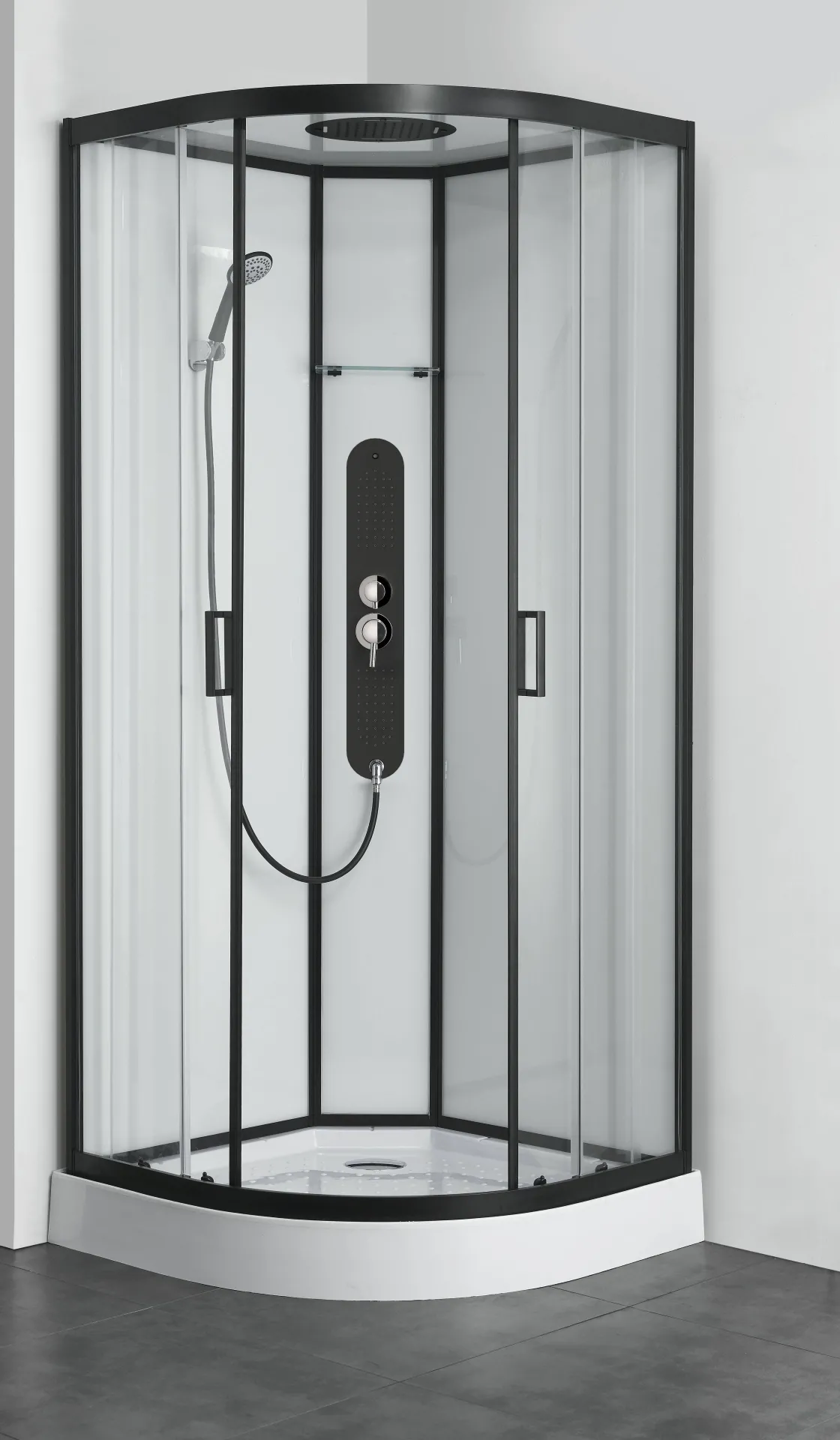 De Kwartronde Douchecabine Uyuni Van Allibert 90X90 Cm Heeft Een Hoekinstap Met 2 Schuifdeuren. De Stijlvolle Douchecabine In De Kleur Zwart Is Eenvoudig Te Installeren Met Een Clipsysteem Waarbij Schroeven En Boren Niet Noodzakelijk Is. De Cabine Is Siliconenvrij En Versterkt Met Transparant Glas. De Deuren Zijn Gemaakt Van 5 Mm Dikke Glas En De Achterwanden Van 4 Mm Wit Veiligheidsglas. De Zeer Platte Profielen In De Kleur Zwart Zijn Gemaakt Van Aluminium En De Handgreep Van Verchroomd Abs.