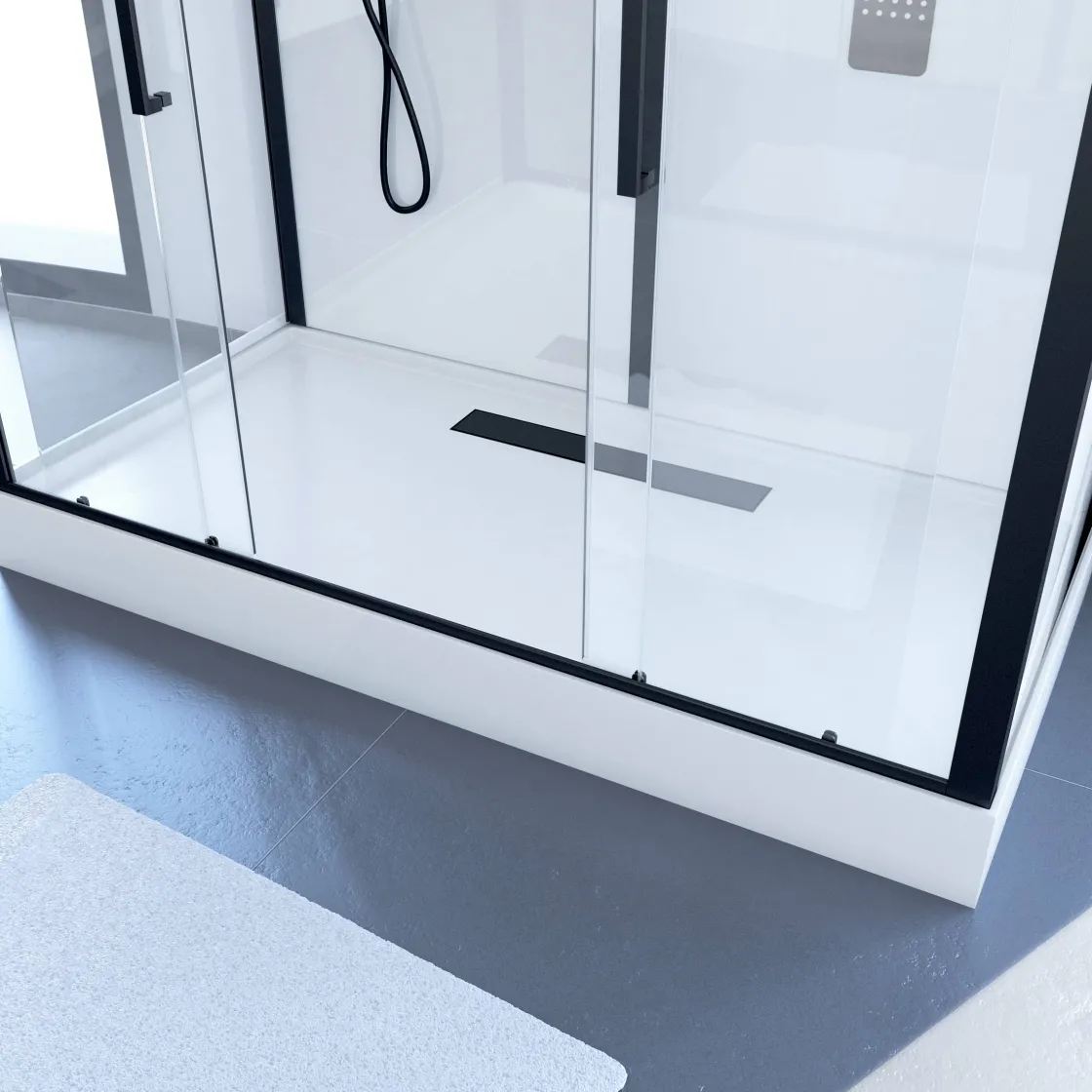 De Complete, Rechthoekige Douchecabine Indus2 Xxl Van Aurlane 85X160X215 Cm Heeft Een Frontale Instap Met Twee Schuifdeuren. De Stijlvolle, Extra Grote Douchecabine In De Kleur Zwart/Wit Is Eenvoudig Te Installeren Met Een Clipsysteem Waarbij Schroeven En Boren Niet Noodzakelijk Is. De Cabine Is Siliconenvrij En Versterkt Met Transparant Glas. De Schuifdeuren Zijn Gemaakt Van 6 Mm Dik Veiligheidsglas En De Bodem En Het Dak Van 5 Mm Gehard Glas. De Profielen In De Kleur Mat Zwart Zijn Gemaakt Van Aluminium En De Handvatten Van Metaal.