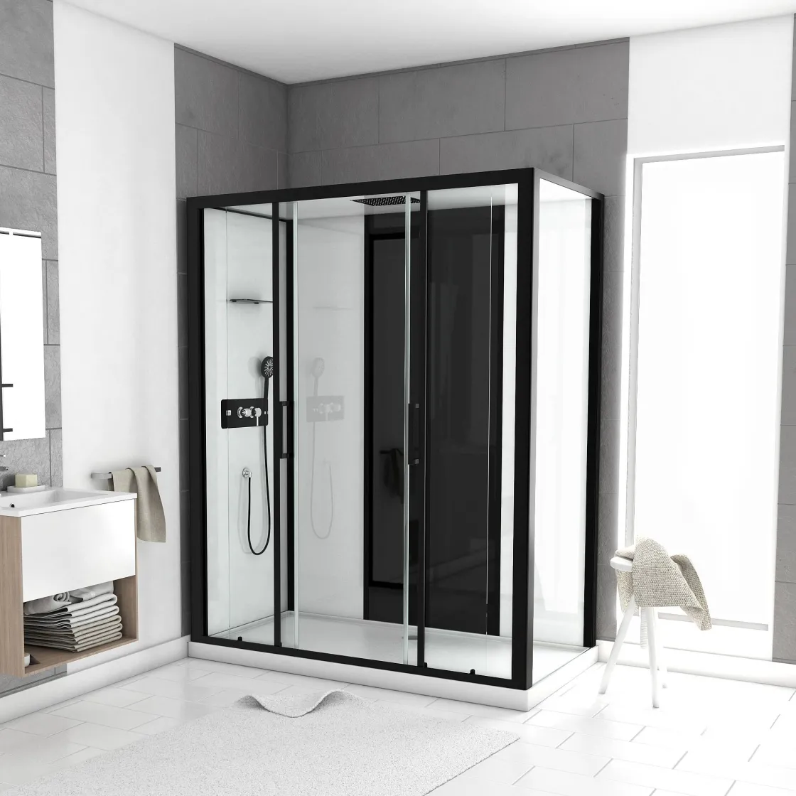 Het Bedieningspaneel Van Roestvrijstaal Heeft Een Mechanische Mixer En Een Antikalk Handdouche Met Een Mat Zwarte Pvc Doucheslang. En Dankzij Het Handige Glazen Plankje Zijn Jouw Douchespullen Altijd Binnen Handbereik. Voor De Meest Ontspannen Douche-Ervaring Maak Je Gebruik Van De 41X28 Cm Hoofddouche Die Geintegreerd Is In Het Dak. De Wit Versterkte Acryl Douchebak Is Voorzien Van Een 150 Mm Hoge Afvoer.
