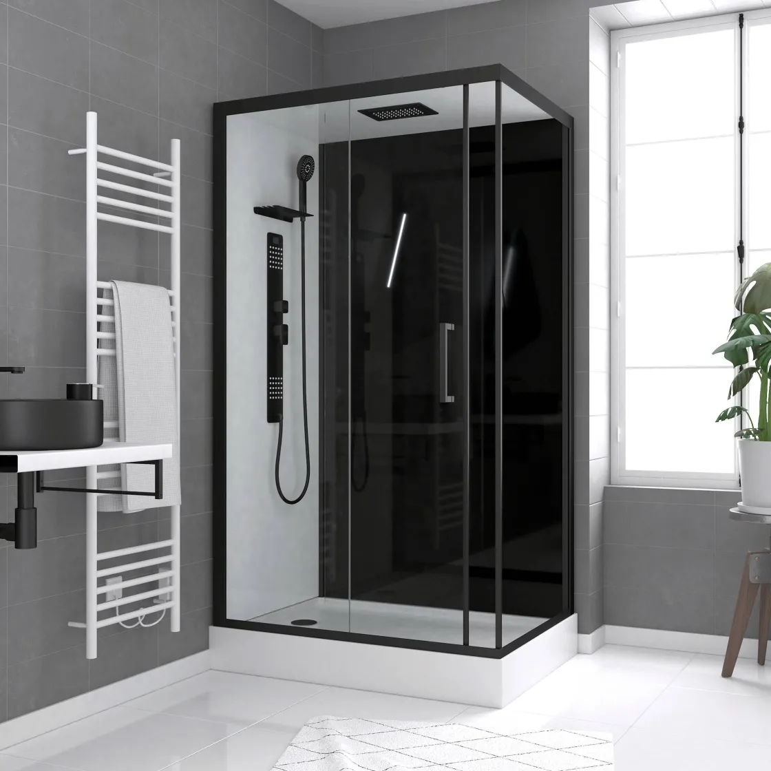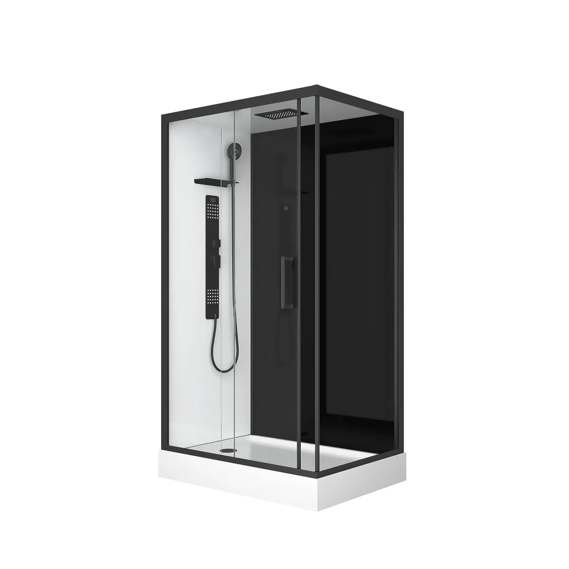 De Douchebak In Acrylwit Heeft Een Stalen Structuur En De Rechthoekige Handvatten Zijn Afgewerkt In De Kleur Mat Zwart. De Douchecabine Is Voorzien Van Een Mat Zwarte Regendouche, Een Mechanische Mengkraan, Een Multi-Jet Hydromassagepaneel En Een Anti-Kalk Handdouche Met Flexibele Pvc Doucheslang. Tijd Om Heerlijk Ontspannen Te Douchen!