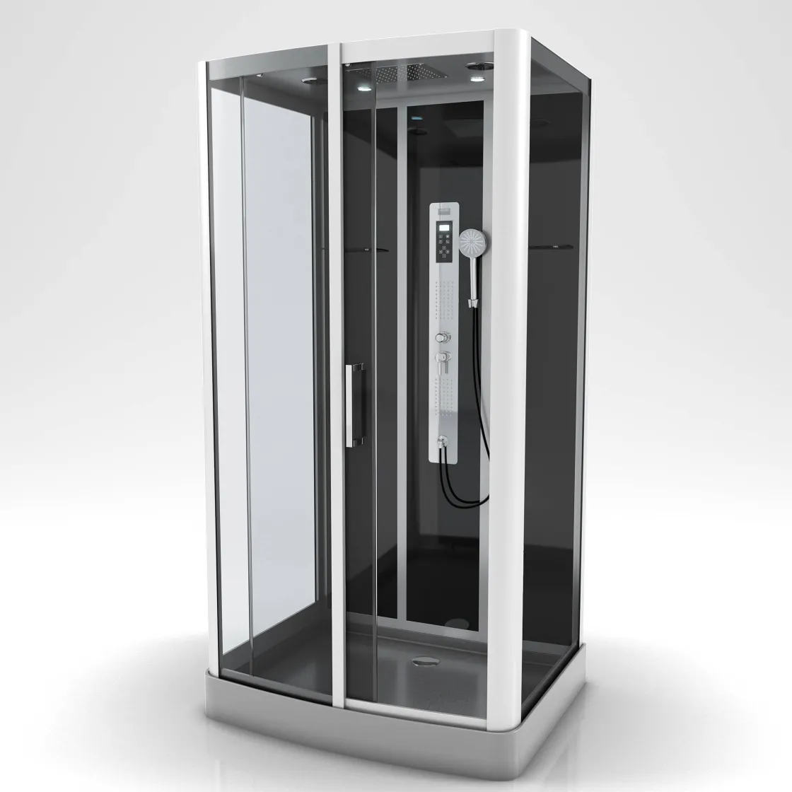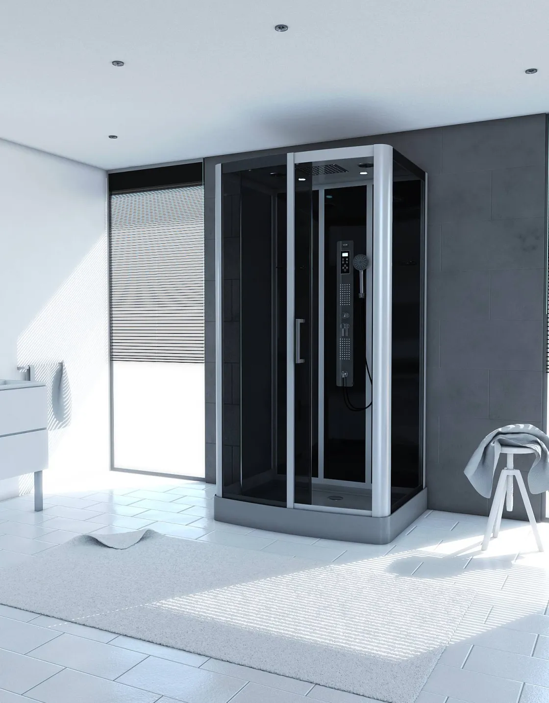 De Aurlane Douchecabine Premium 2 Heeft Een Rechthoekige Vorm En Is 215 Cm Hoog, 115 Cm Breed En 90 Cm Diep. De Vereiste Hoogte Om De Douchecabine Te Installeren Is 230 Cm. Dankzij De Gelakte Metaalgrijze Aluminium Structuur Krijgt De Douchecabine Een Luxe Uitstraling. Daarnaast Beschikt De Cabine Over Een Schuifdeur Van Gehard Glas Van 6 Mm Dik Met Magnetische Sluiting, Een Chromen Handvat En Een Zwarte Achterwand Van Gehard Glas. Het Dak En De Douchebak Bestaan Uit Versterkt Acryl In Een Grijze Kleur. In Het Dak Is Een Chromen Regendouche Geinstalleerd. Met Het Touchscreen Bedieningspaneel Activeer Je Fm-Radio En De Bluetooth Led-Spots. Tevens Beschikt De Cabine Over Een Afzuigkap Voor Stoom, Een Multi-Jet Hydromassagepaneel En Een Antikalk Handdouche. Een Mechanische Mengkraan En Een Hoge Afvoer Van 90 Mm Maken Deze Cabine Compleet. Een Zwart Composiet Houten Rooster Wordt Meegeleverd.