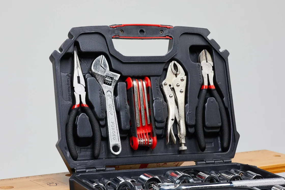 Deze Baseline Gereedschapset Bestaat Uit 45 Delen: 150Mm Telefoontang, 150Mm Zijsnijtang, 125Mm Griptang, 150Mm Verstelbare Moersleutel, 8Dlg Inbussleutelset, 3/8″ Ratelsleutel, 3/8″ Verlengstuk 50Mm, Adapter, 14X 1/4″ Doppen (4-4,5-5-5,5-6-6,5-7-7,5-8-9-10-11-12-13Mm) En 15X 3/8″ Doppen (L 8-9-10-11-12-13-14-15-16-17-18-19-20-21-22Mm).