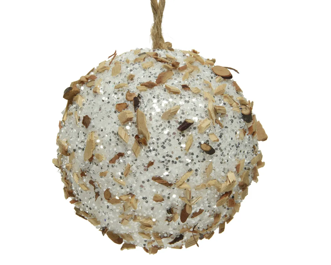 Gooi De Kerstversiering Om Met Deze Unieke Decoris Kerstbal. De Witte Kerstbal Is Versierd Met Stukjes Hout En Glinstert In Elke Kerstboom. Incusief Jute Hanger.