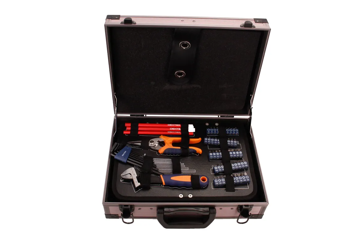 Inhoud Van De Koffer: 1 Waterpomptang 250 Mm, 1 Combinatietang 160 Mm, 1 Draadstripper, 1 Verstelbare Moersleutel 200Mm, 1 X 180 Mm Schaar, 6 Schroevendraaiers (Sl3X75, Sl4X75, Sl5,5X75, Ph0X60, Ph1X80 En Ph2X100), 4 Precisieschroevendraaiers, Sl1. 5/2 0.Ph0/Ph00, 7 Inbussleutels 1,5-6 Mm, 1 Handgreep 1/4”, 1 Koppeling 1/4″, 50 Bits, 1 Magnetische Bithouder, Een 1/4” Ratel, 10 Dopsleutelinzetstukken 1/4″” (5-5.5-6-7-8-9-10-11-12-13Mm), Een 100 Mm 1/4” Verlengstuk, 1 Ratel 3/8″” 75Mm , 7 X 3/8″” Dopsleutels (13-14-15-16-17-18-19 Mm), 2 Bougie Dopsleutels 3/8″”( 16 En 21Mm),1 Adapter Voor 1/4 Bits, 1 X 25 Mm Timmermanshamer, 1 Waterpas Van 30 Cm, Een 3 M X 19 Mm Rolmaat, 3 Timmermanspotloden En Een 18 Mm Breekmes Met 5 Reservemesjes.