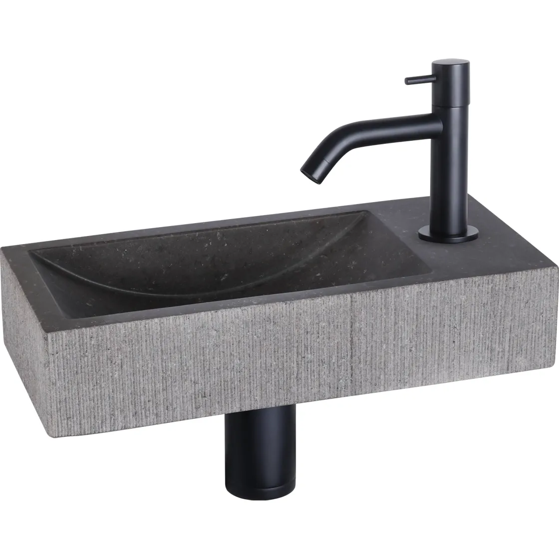 Deze Set Bestaat Uit Het Strak Vormgegeven Wasbakje Ribble Van Hoogwaardig Natuursteen Met Mat Zwarte Gebogen Koudwaterkraan, Afvoerplug En Sifon. Het Kraangat Zit Aan De Rechterkant Van Dit Subtiele Wasbakje. Het Van Hoogwaardig Natuursteen Is Een Natuurlijk Materiaal Dat Een Zeer Luxe Uitstraling Aan Jouw Toiletruimte Geeft. Afmeting: 38 X 18 X 8 Cm
