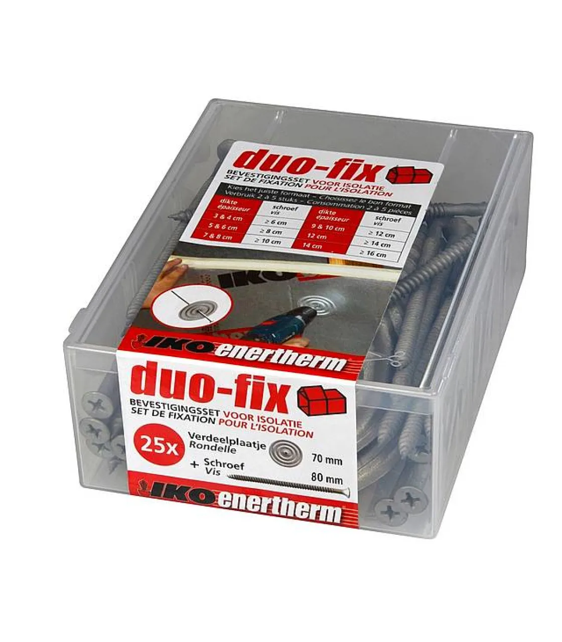 De Duo-Fix Bevestigingsset Is Een Handige Bevesting Bestaande Uit Drukverdeelplaatjes En Schroeven. Is Geschikt Voor De Bevestiging Van De Iko Enertherm Isolatieplaten. Kies De Juiste Set Op Basis Van De Dikte Van Je Isolatieplaten.