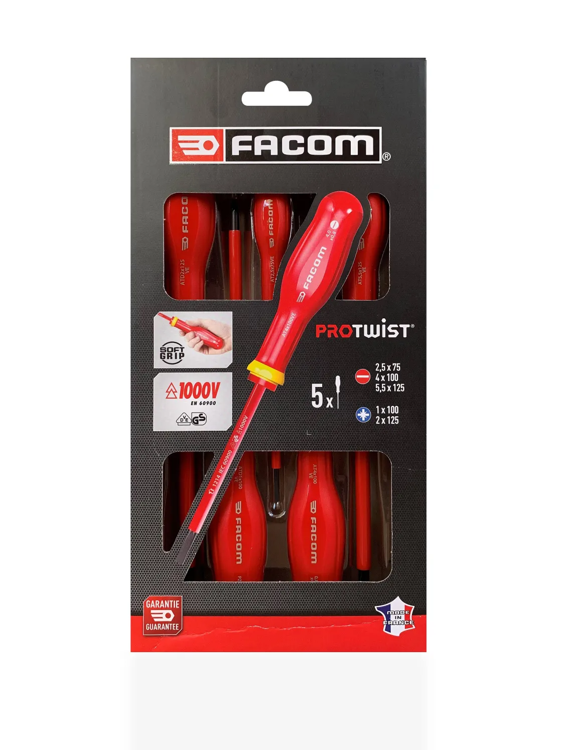 Deze Schroevendraaierset Van Facom Is Geschikt Voor Spanningswerkzaamheden Tot 1000 Volt Wisselstroom En 1500 Volt Gelijkstroom. De Set Is Conform Met De Norm En 60900. De Set Beschikt Over Drie Platte Schroevendraaiers Met Afmeting Van 2,5 X 75 Mm, 4 X 100 Mm En 5,5 X 125 Mm. Daarnaast Ontvang Je Twee Kruiskopschroevendraaiers Met Afmeting 100 X 1 Mm En 2 X 125 Mm. Alle Schroevendraaiers In Deze Set Beschikken Over Een Softgrip Handvat Voor Extra Comfort Tijdens Het Werken.