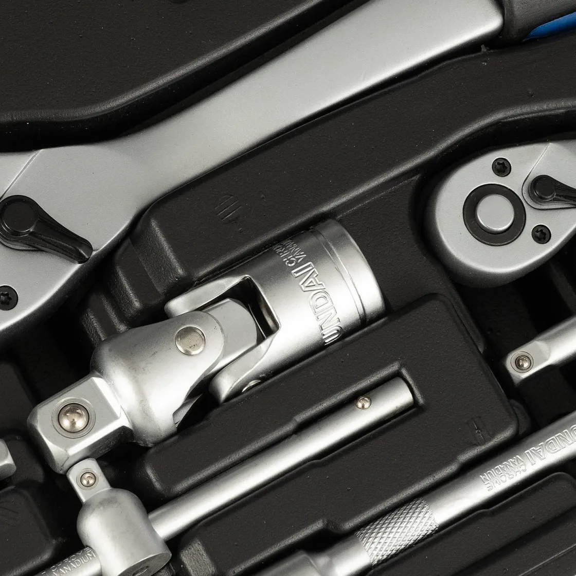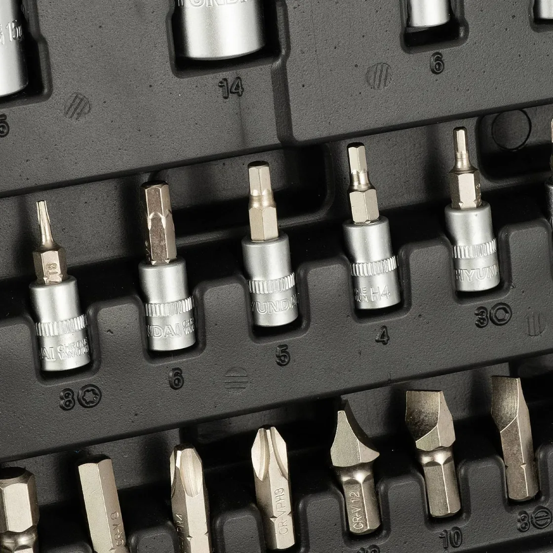 Complete 94-Delige Hyundai Gereedschapset Voor Elk Karwei, Inclusief 1/2 En 1/4 Ratels. Deze Set Bevat Een Groot Aantal Aansluitingen (Van 4 Tot 32 Millimeter) En Driverbits (Plat, Kruis, Zeshoekig, Torx). Bovendien Is De Set Uitgerust Met Een Brede Serie Aan Accessoires.