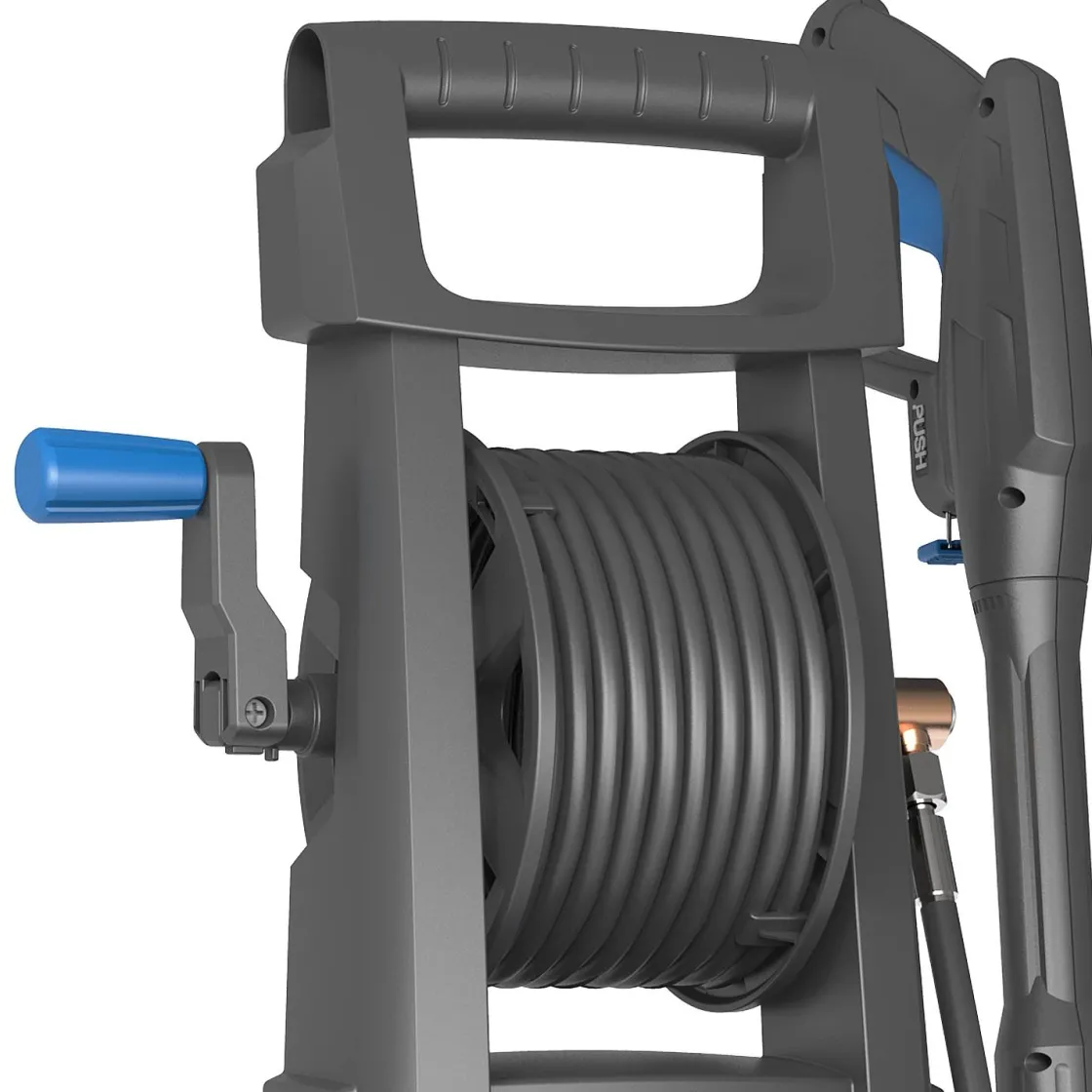 Hij Wordt Geleverd Met Een Spuitpistool, Een Lans, Een Zeepreservoir Van 1 Liter, Een Regelbare Spuitmond, Een Overgangsadapter, Een Terrasreiniger, Een Universele Slangkoppeling En Een Reinigingspen Voor De Sproeikop. De Hoge Beugel En De Twee Wielen Vergemakkelijken Het Transport. De 5 Meter Lange Stroomkabel En De 5 Meter Hogedrukslang Bieden Veel Bewegingsvrijheid. Door De Slanghaspel, Pistoolhouder, Spuitstuk Houders En Kabelhouder Is Het Apparaat Inclusief De Accessoires Netjes Op Te Bergen Na Gebruik.