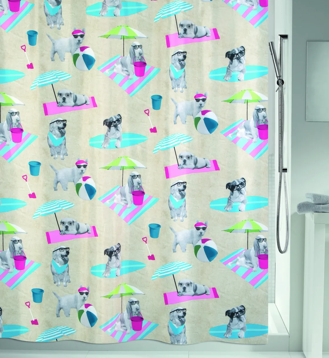 Met Het Douchegordijn Beach Dogs Vrolijk Je Helemaal Je Badkamer Op! Het Gordijn Is 180 Cm Breed, Gemaakt Van Polyester En Voorzien Van Gaten Voor De Doucheringen.