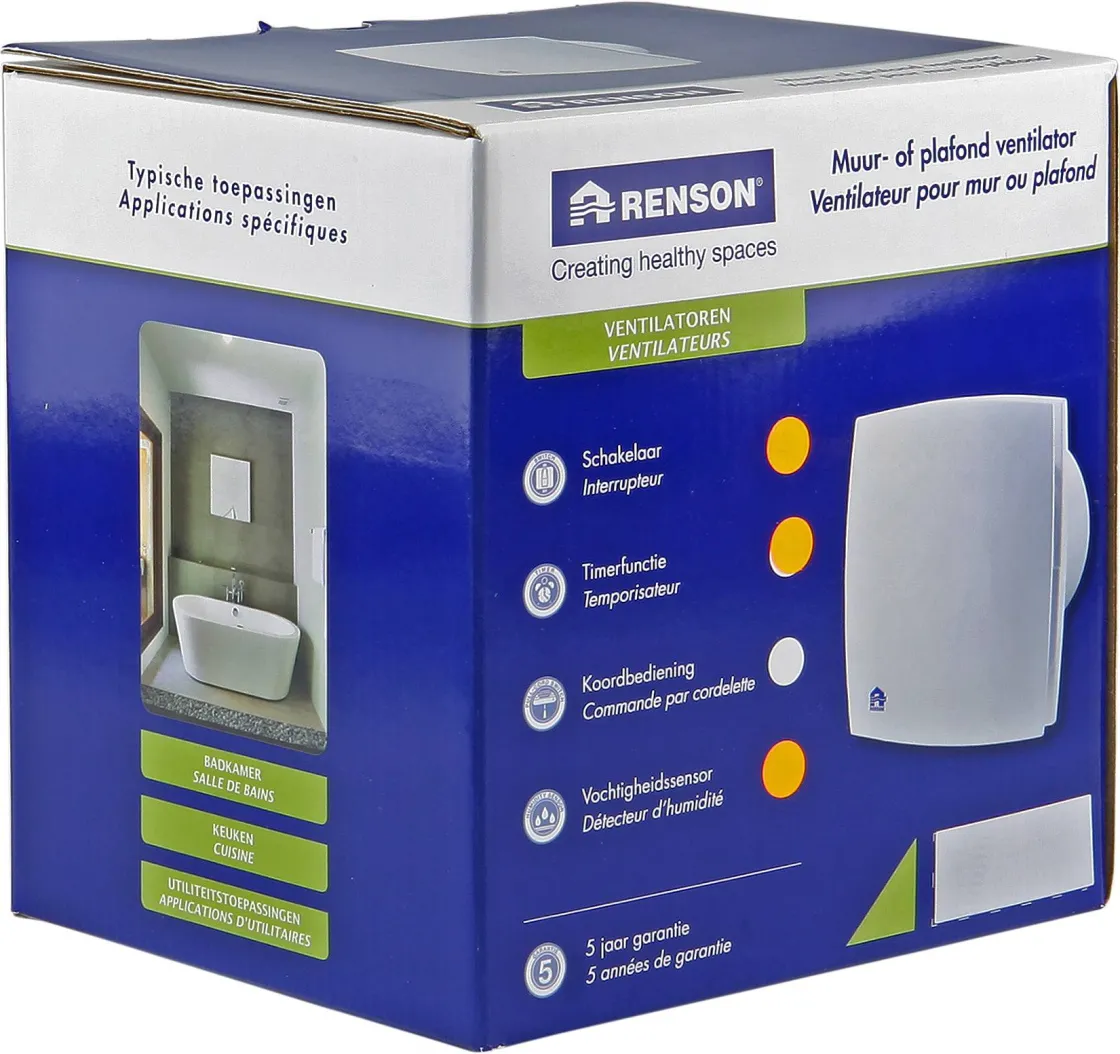 De Inbouwventilator 7412H Van Renson Met Een Diameter Van 125 Mm Is Geschikt Voor Het Ventileren Van Ruimtes Tot 10M². Je Monteert Deze Design Ventilator Met Grijs Front Eenvoudig In De Wand Van Een Kamer. Dankzij De Timerfunctie Stel Je De Design Ventilator Zelf In Waardoor Deze Automatisch Enige Tijd Blijft Draaien En Na De Ingestelde Tijd Automatisch Weer Stopt. De Vochtsensor Zorgt Ervoor Dat De Inbouwventilator Begint Te Draaien Zodra Het Vochtgehalte In De Kamer Toeneemt.