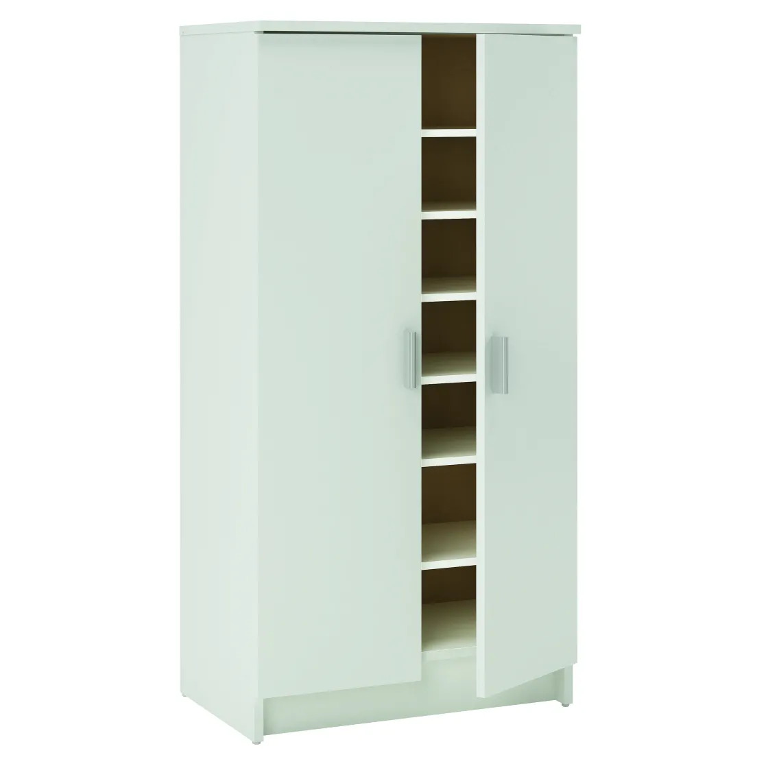 Deze Multifunctionele, Witte Schoenenkast Met Twee Openslaande Deuren Is Voorzien 6 Verwijderbare Legplanken Met Ieder Een Afmeting Van 51X29 Cm. De Handvatten Zijn Afgewerkt In De Kleur Grijs.