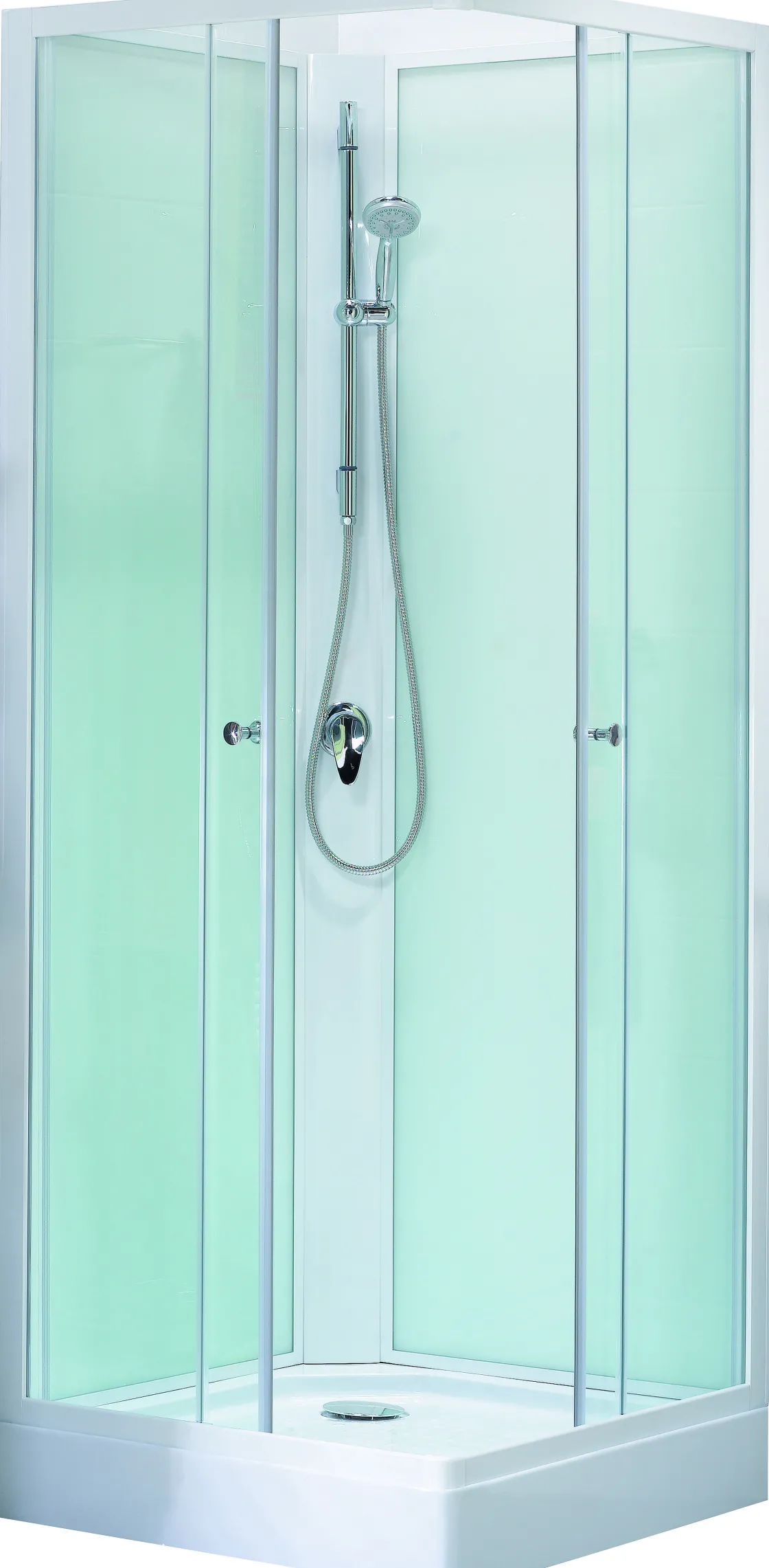 De Stijlvolle, Vierkante Douchecabine Claudel Van Sencys Is 80X80 Cm En Past In Iedere Badkamer. De Voorwandstructuur Bestaat Uit Twee Glazen Schuifpanelen En Twee Glazen Wanden Met Een Dikte Van 5 Mm. De Achterwand Structuur Bestaat Uit Drie Delen: Twee Achterwanden Van Lichtgroen Glas Met Een Dikte Van 4 Mm En Een Pvc Kolom. Daarin Is Een Doucheset, Slang En Stang Bevestigd Met Een Eengreepsmengkraan. De Witte Douchebak Is Vervaardigd Uit Abs En Heeft Een Dikte Van 2,5Mm.