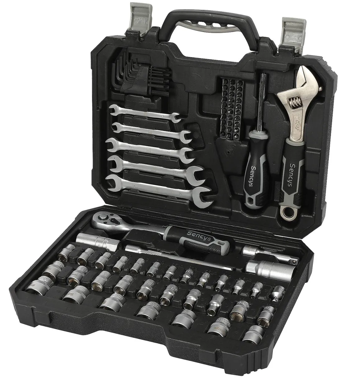 De Sencys Gereedschapset Bestaat Uit 82 Delen En Komt In Een Stevige Kunststof Opbergkoffer. De Set Bestaat Uit Een Schroevendraaier Handvat Voor Bitjes, 30 Bitjes, Een Verstelbare Moersleutel, Een Set Inbussleutels, 5 Steeksleutels, Een Ratel Met Diverse Opzetstukken En 30 Doppen. Een Prachtige Set Voor De Beginnende Klusser!