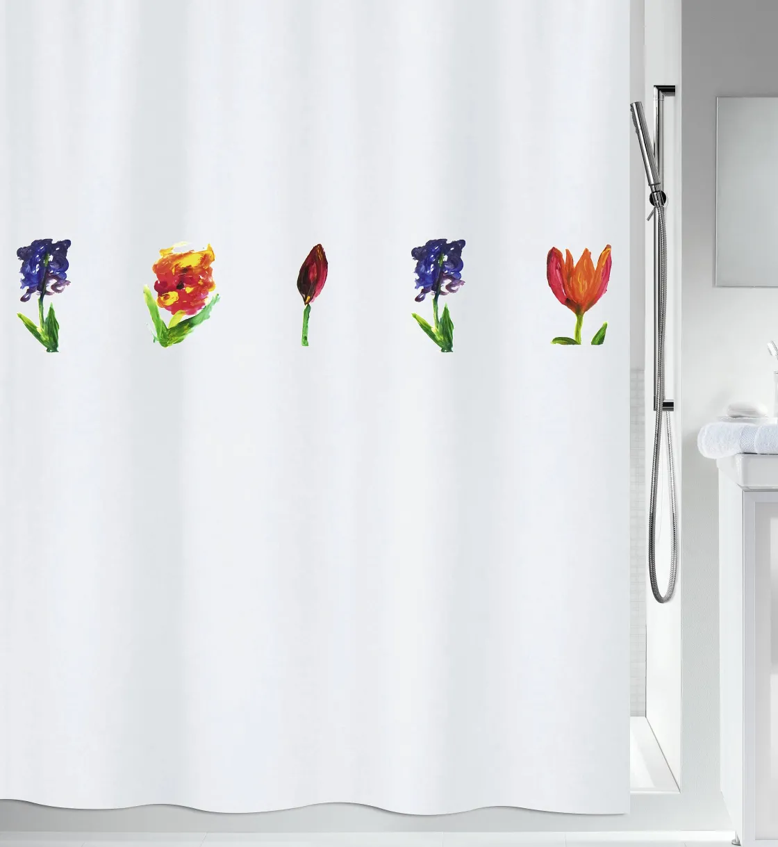 Het Douchegordijn Mano Met Tulpenprint Van Spirella Is 180 Cm Breed, Gemaakt Van Polyester En Voorzien Van Gaten Voor De Doucheringen.