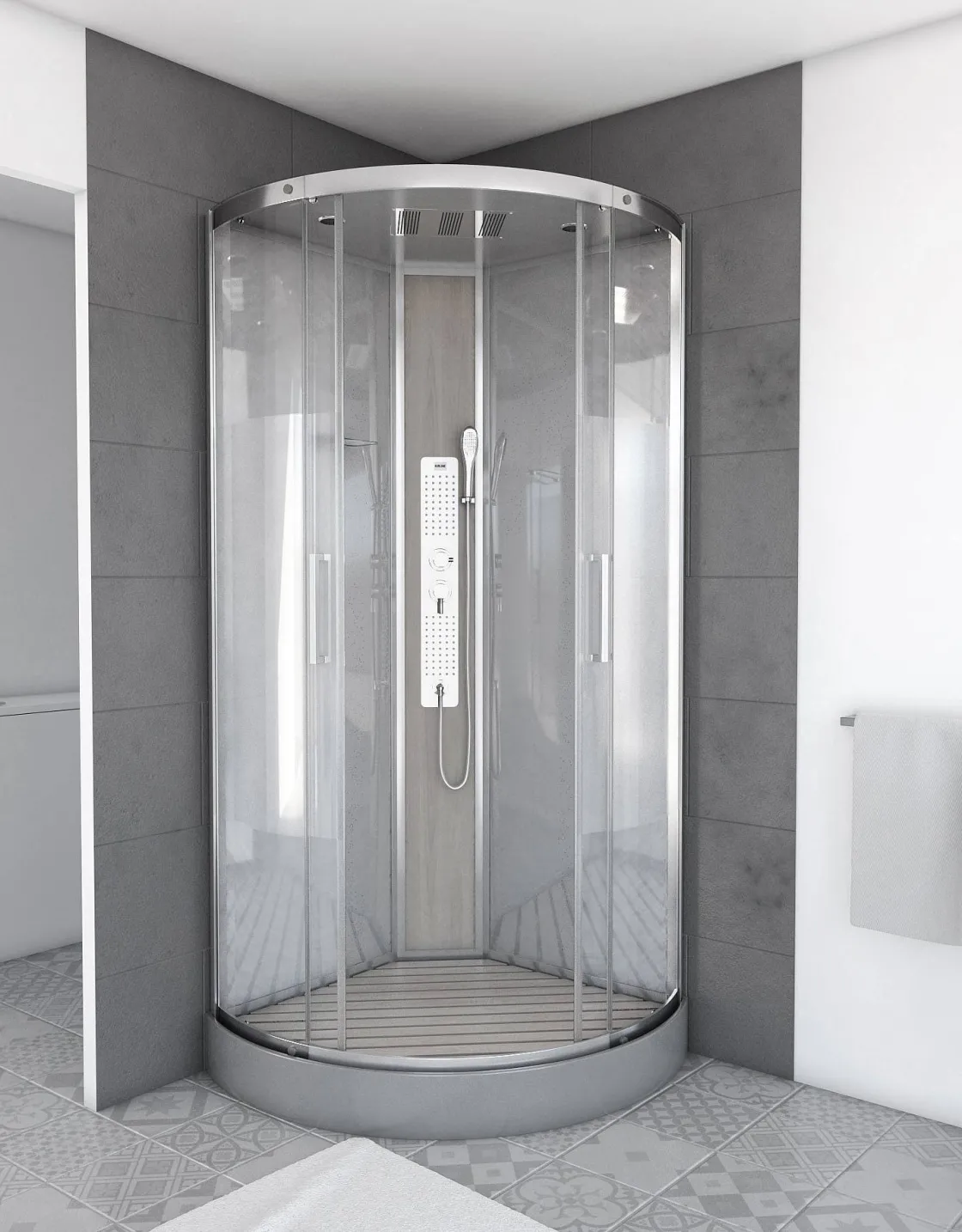 De Aurlane Douchecabine ‘Finlandia Round’ Is Een Douche In De Vorm Van Een Kwart Rond. De Profielen Zijn In Antracietgrijs Gelakt Aluminium Met Achterwand In Grijs Getemperd Glas 5 Mm. Het Geheel Omvat: Een Schuifdeur In Getemperd Glas 6 Mm, Grijze Centrale Composietkolom Met Brede Jets Gemonteerd Op Inox Plaat, Dak In Grijs Acryl Met Grote Hoofddouche In Inox Om Van Het Zachte En Lichte Regen Te Kunnen Genieten, Een Douchebak In Grijs Versterkt Acryl, Een Magnetische Sluiting En Handgrepen In Inox.