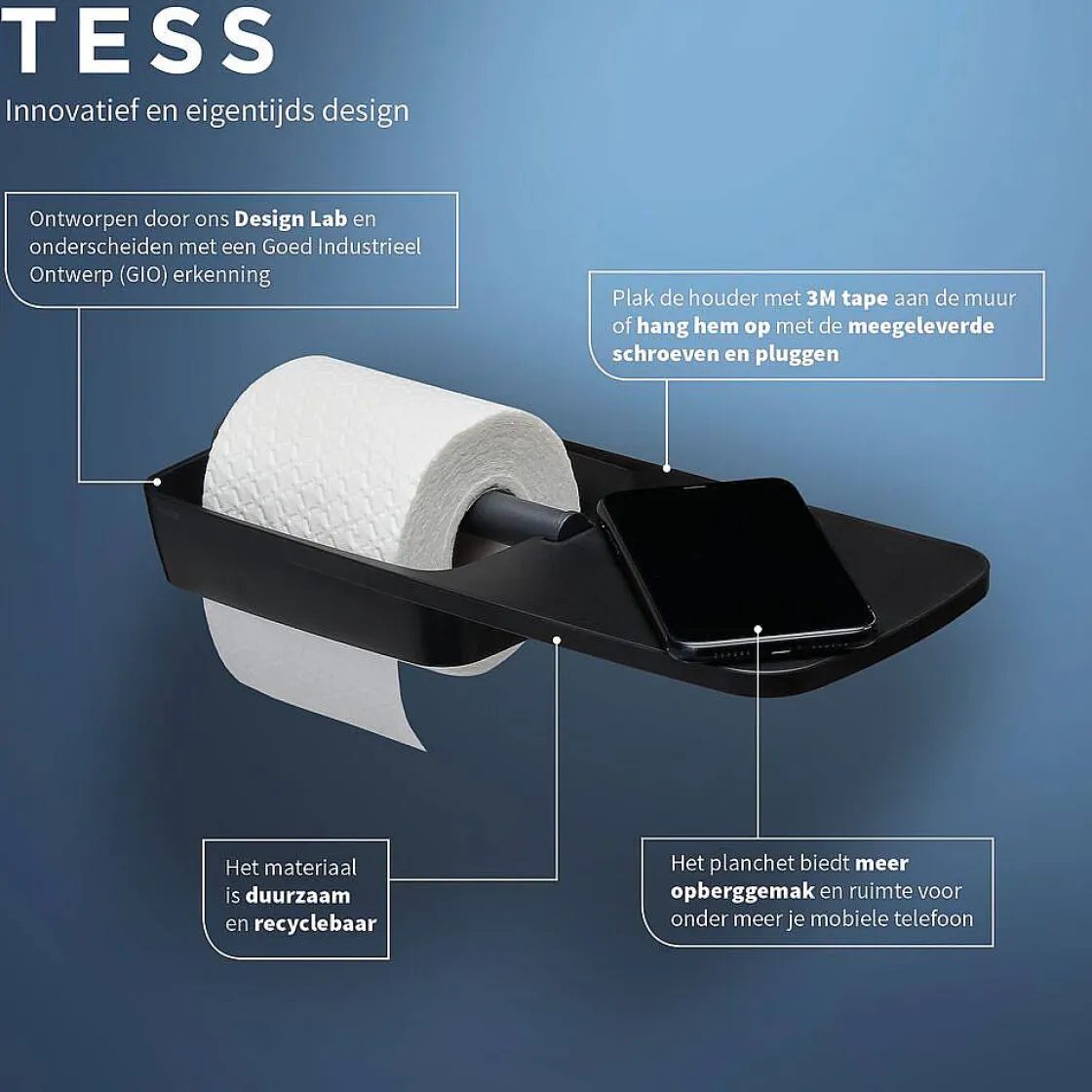 Modern En Functioneel Design. De Subtiele, Ronde Vormen Van Deze Zwarte Tiger Tess Toiletrolhouder Zorgen Voor Meer Balans En Rust In De Badkamer. Het Planchet Biedt Extra Ruimte Voor Je Mobiele Telefoon Bijvoorbeeld. Plak De Houder Aan De Muur Of Monteer Hem Met Schroeven En Pluggen, Jij Kiest! Tiger Tess Is Innovatief En Eigentijds Met De Herkenbare Kwaliteit Van Tiger. Deze Serie Is Ontworpen In Nederland En Heeft Een Erkenning Gekregen Van Goed Industrieel Ontwerp (Gio).