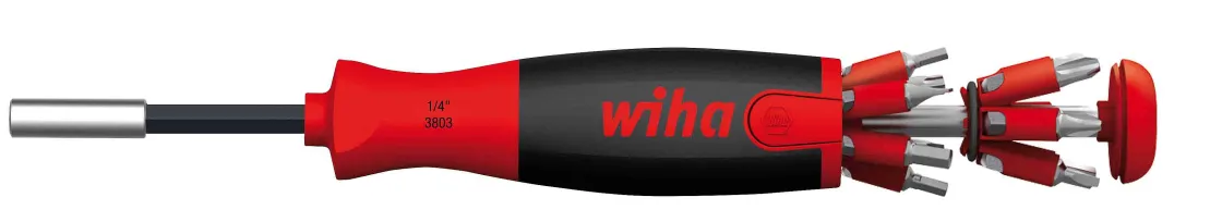 Het Komt Regelmatig Voor, Dat Er In Het Veld Een Schroevendraaier Nodig Is Met Net Dat Ene Profiel Dat De Vakman Niet Bij Zich Heeft. De Wiha Schroevendraaier Met Bitmagazijn Liftup Maakt Daar Een Eind Aan, Want Met Slechts Een Gereedschap Heeft Hij 12 Verschillende Profielen Bij De Hand. De Liftup Vervangt Zo Een Complete Schroevendraaierset. Met Een Druk Op De Knop Komt Het Bitmagazijn Omhoog Uit Het Uiteinde Van De Handgreep Zodat De 25 Mm Bits Met 1/4″ Aansluiting Kunnen Worden Uitgenomen.
