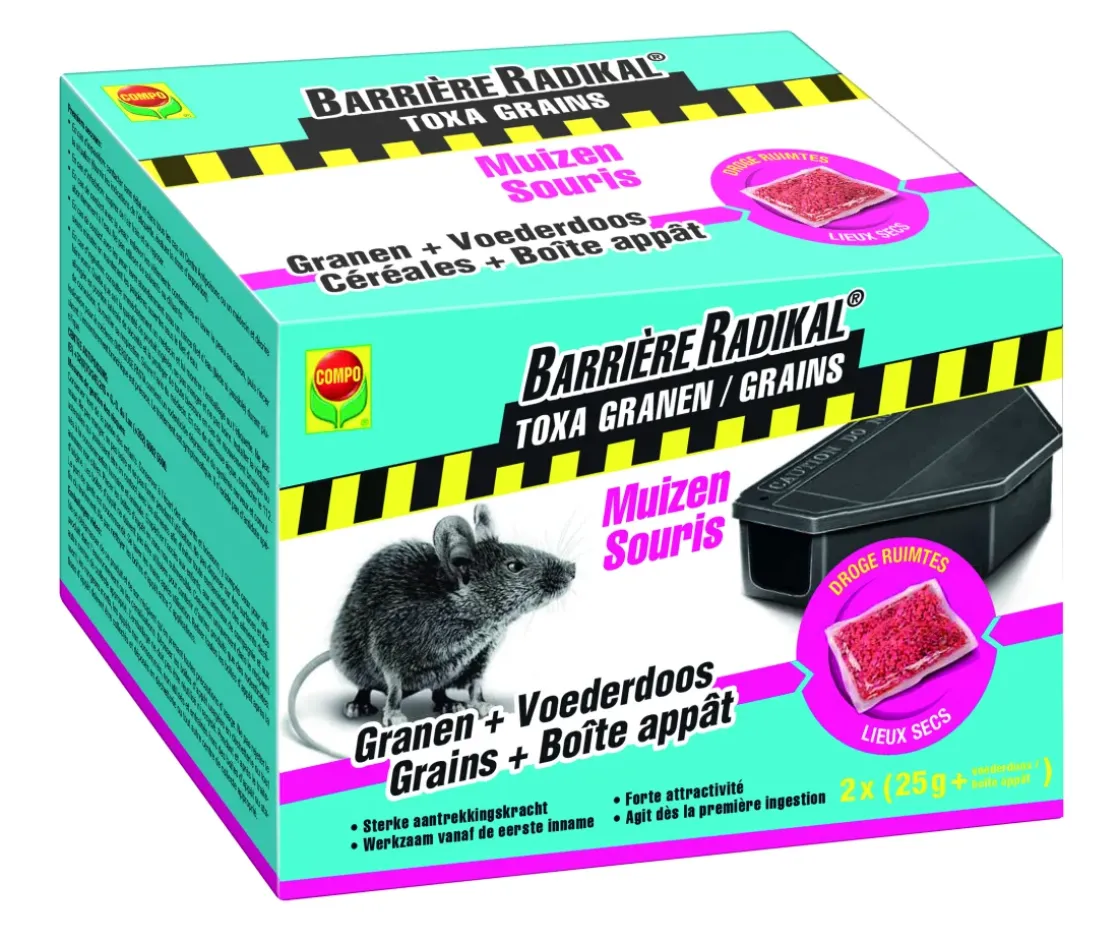 Compo Barriere Radikal Toxa Graantjes Is Geschikt Voor De Bestrijding Van Muizen En De Schade Die Ze Veroorzaken. De Graantjes Zijn Ideaal Voor Gebruik In Droge Ruimtes Zoals Garages En Zolders. De Ingredienten Zijn Speciaal Geselecteerd Vanwege Hun Hoge Aantrekking Op Muizen. Vanaf De Eerste Inname Is Het Lokaas Werkzaam.