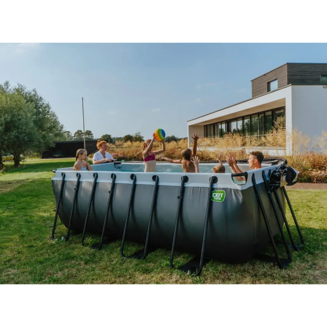 Het Stalen Zwarte Frame Van Het Zwembad Is Extra Dik Met Een Diameter Van 50 Mm En De Frame-Poten Zorgen Voor Optimale Stabiliteit, Zodat Het Zwembad Altijd Stevig Blijft Staan. Natuurlijk Is Er Ook Aan Duurzaamheid Gedacht: Het Zwarte Frame Is Gegalvaniseerd En Gepoedercoat Zodat Roest Geen Kans Maakt. Het Duplex Coating Systeem Noemen We Dat Bij Exit Toys.