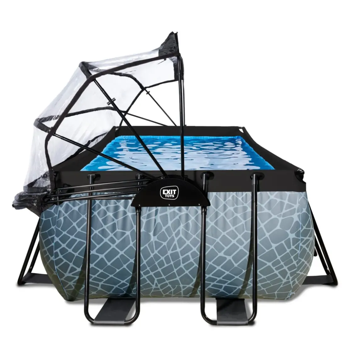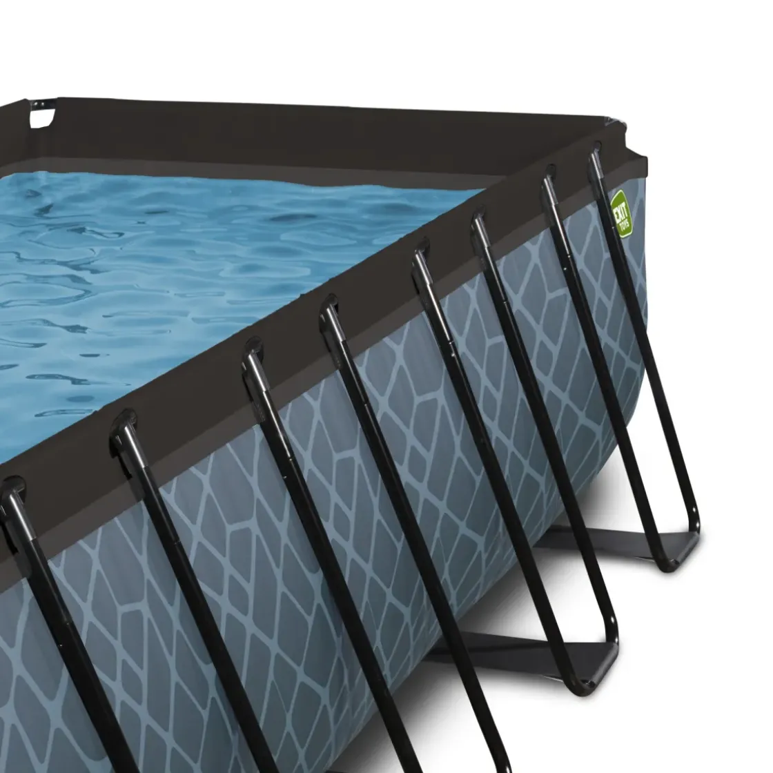Het Exit Stone Zwembad 400 X 200 X 100 Cm Is Een Rechthoekig Grijskleurig Frame Zwembad Met Overkapping. Het Zwembad Is Standaard Voorzien Van Een Zandfilterpomp, Warmtepomp En Een Zwembadtrap, Waarmee Je Veilig Het Zwembad In En Uit Kunt Stappen. Het Stone Zwembad Heeft Een Modern En Stoer Steenpatroon Op De Zijkant En Is Daarmee Een Echte Blikvanger In De Tuin. Het Exit Zwembad Is Uitgevoerd Met Sterke 3-Laags Wanden Van Pvc En Polyester En De Binnenzijde Van Het Zwembad Is Blauw, Voor Het Frisse Zwembadgevoel.