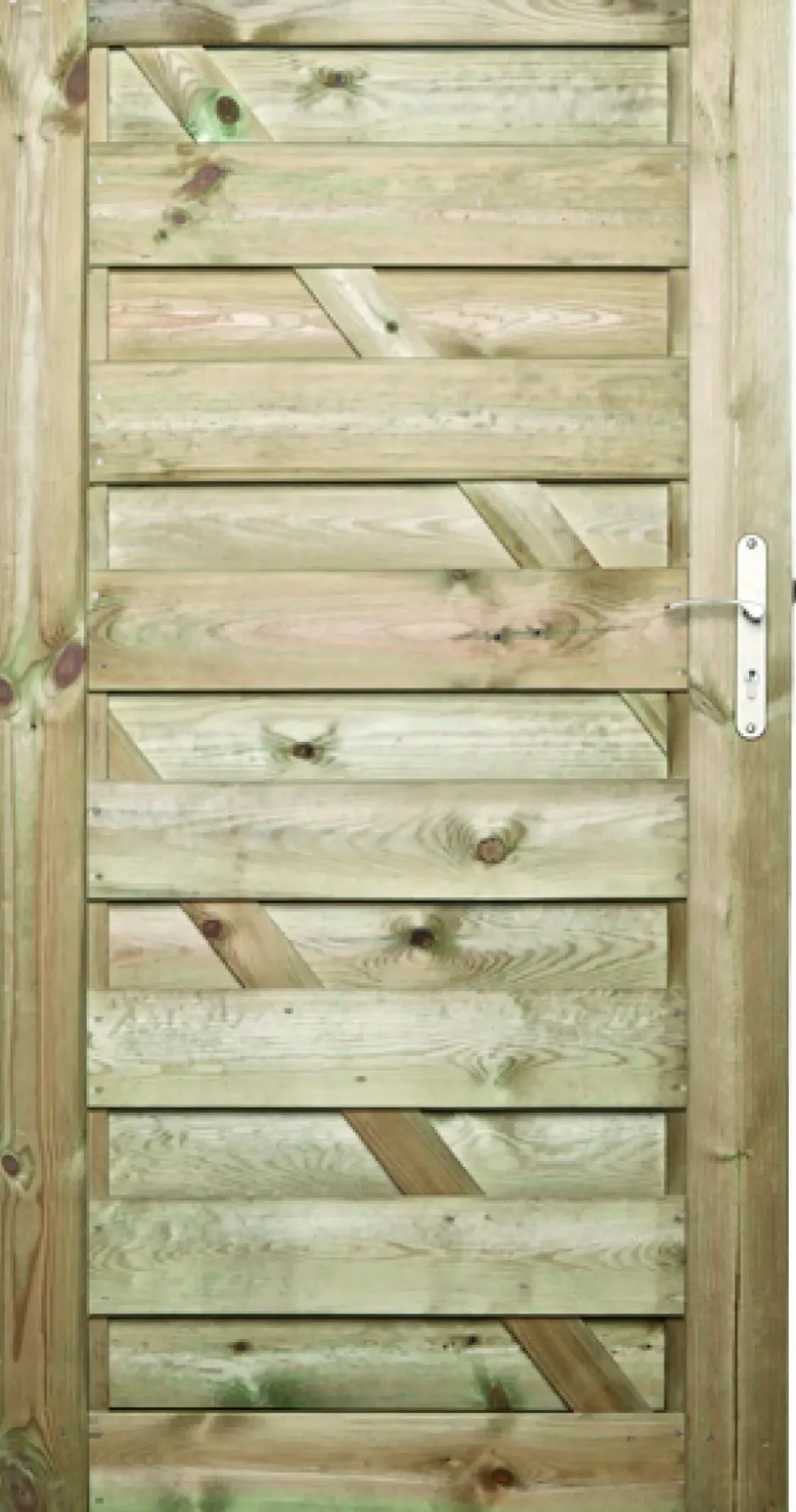 Deze Fraaie Tuindeur Van Behandeld Grenenhout Zorgt Voor Een Trendy Look In Je Tuin. De Poort Heeft Een Horizontale Beplanking En Een Standaardafmeting Van 1800 Mm Hoog En 900 Mm Breed. De Beplanking Van Deze Faro Hori Poort Bestaat Uit Fijn Geschaafd Grenen Planken Die Stevig Werden Vastgeschroefd Met Inox Vijzen Op Een Houten Kader. De Faro Hori Tuindeur Is Duurzaam, Sterk En Tijdloos. Deze Kant En Klare Poort Wordt Geleverd Met Alle Nodige Hang- En Sluitwerk. Omdat De Levensduur Van Deze Houtsoort Van Nature Beperkt Is, Wordt Dit Hout Steeds Geimpregneerd. Impregneren Is Het Onder Vacuum En Druk Behandelen Van Hout Met Als Doel De Natuurlijke Levensduur Van Het Hout Te Verlengen. Impregnatie Voorkomt Aantasting Van Het Hout Door Schimmels, Zwammen Of Insecten. Dankzij Deze Behandeling Is Deze Poort Onderhoudsvrij En Gaat Ze Lang Mee. Ook Verkrijgbaar Met Verticale Beplanking.