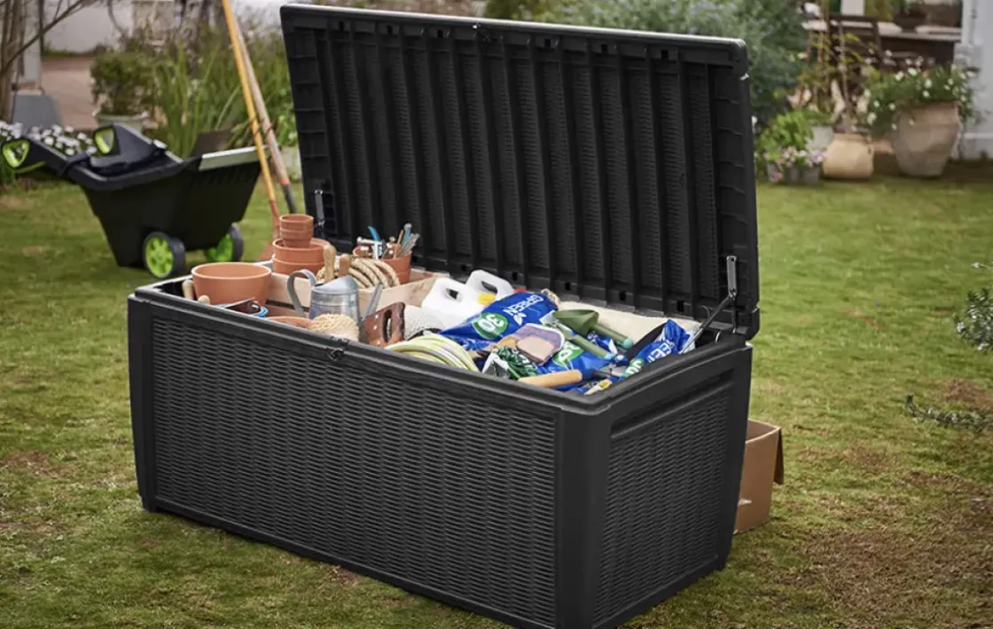 In De Ruime Tuinkussen Opbergbox Sumatra Van Keter Kan Je Al Jouw Tuinspullen Opbergen. De Berging Is Gemaakt Van Duurzaam Kunststof, Heeft Een Inhoud Van 511 Liter En Is Voorzien Van Een Modern Wicker Design. De Deksel Is Voorzien Van Gasveren Zodat Je Hem Eenvoudig Kan Openen En Sluiten. Je Kan De Box Ook Gebruiken Als Zitbankje.