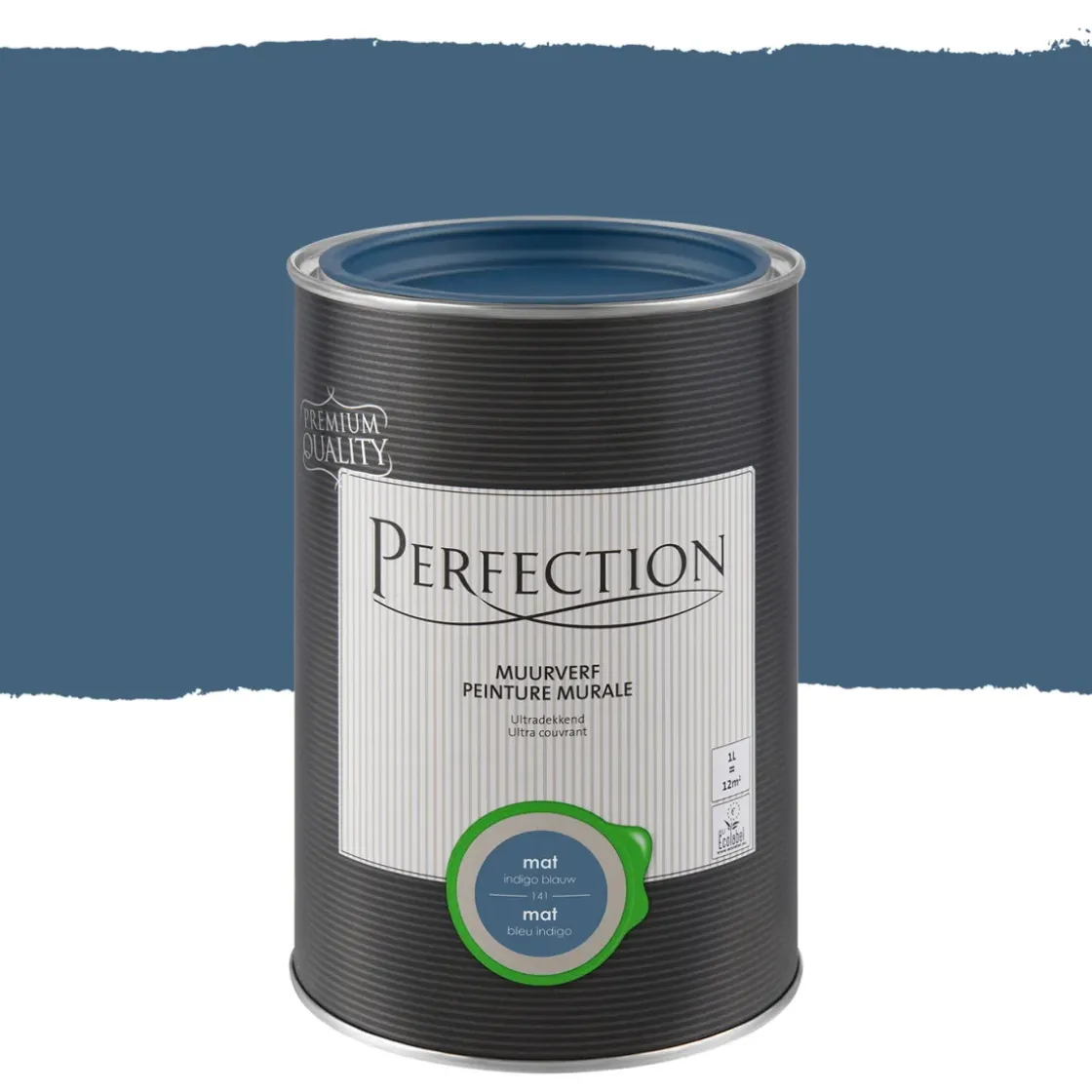 Deze Ultradekkende Matte Muurverf In De Tint Indigoblauw Van Perfection Is Een Blauwe Verf Op Waterbasis. Een Pot Van 1 Liter Is Goed Voor 12 M².