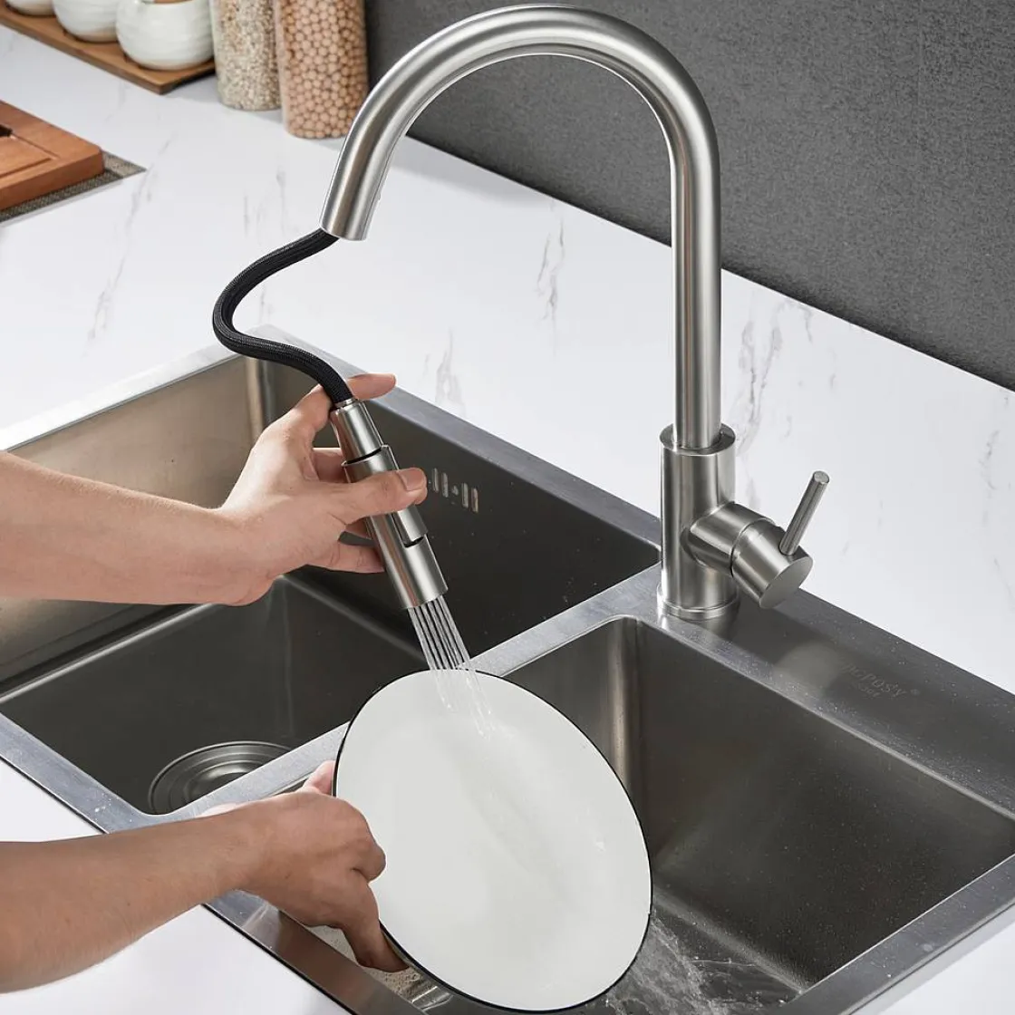 Maak Kennis Met De Innovatieve Nymex Kraan! Deze Kraan Is Voorzien Van Een Uittrekbare Kraankop Met 2 Verschillende Stralen, Waardoor Je Eenvoudig Kunt Schakelen Tussen Een Brede En Een Gerichte Straal.