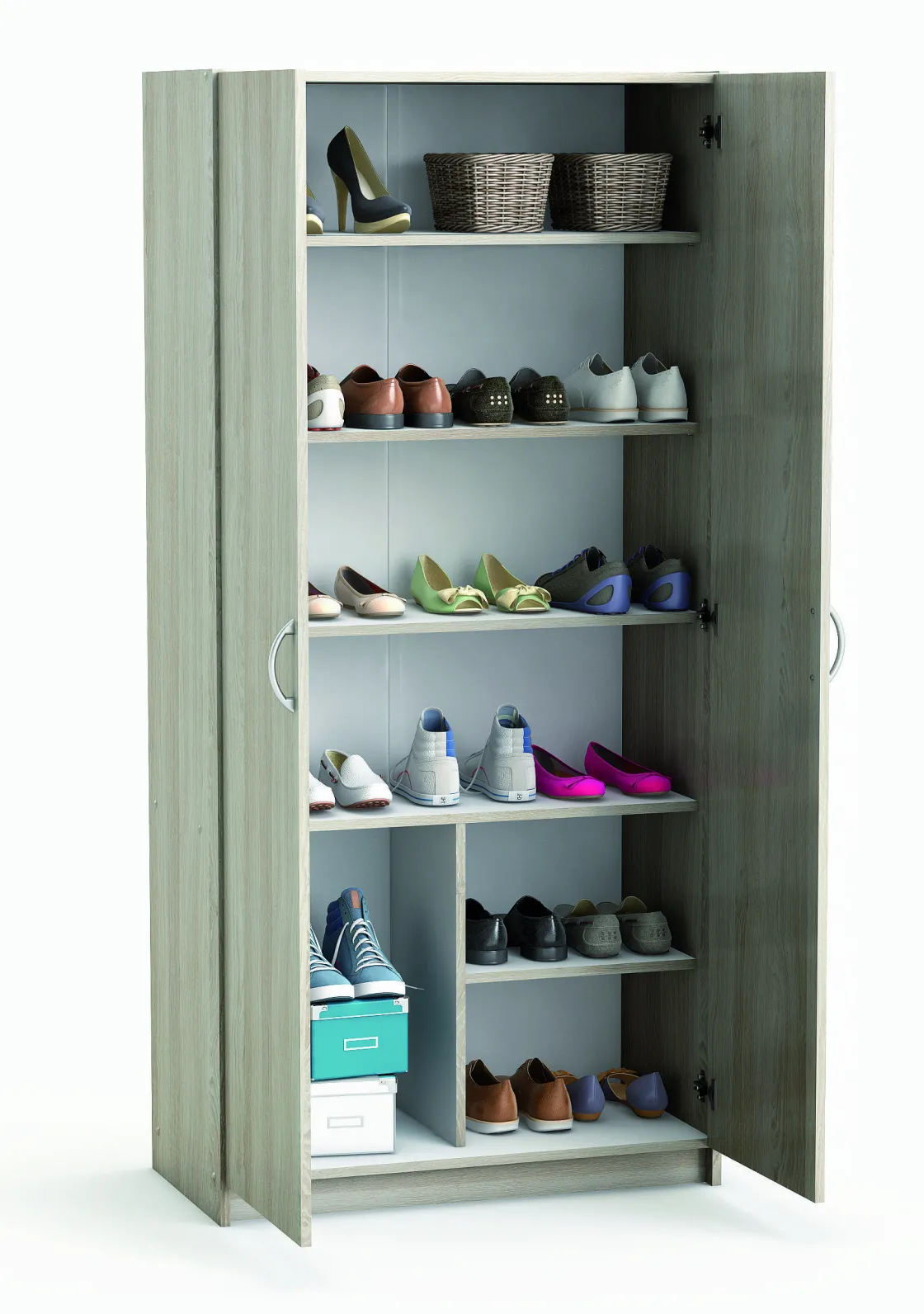 Met Zijn Bleke Tint Zal De 2-Deurskast ‘Multifonctions’ Perfect Werken In Elke Kamer Van Het Huis. Deze Multifunctionele Kast Met 5 Legplanken, Waarvan Er 4 Uitneembaar Zijn, Kan Worden Gebruikt Als Schoenenkast (18 Paar) Of Als Was-, Kelder- Of Linnenkast. De Hoge Uitsparing Biedt Plaats Aan Laarzen Of Hoge Voorwerpen.