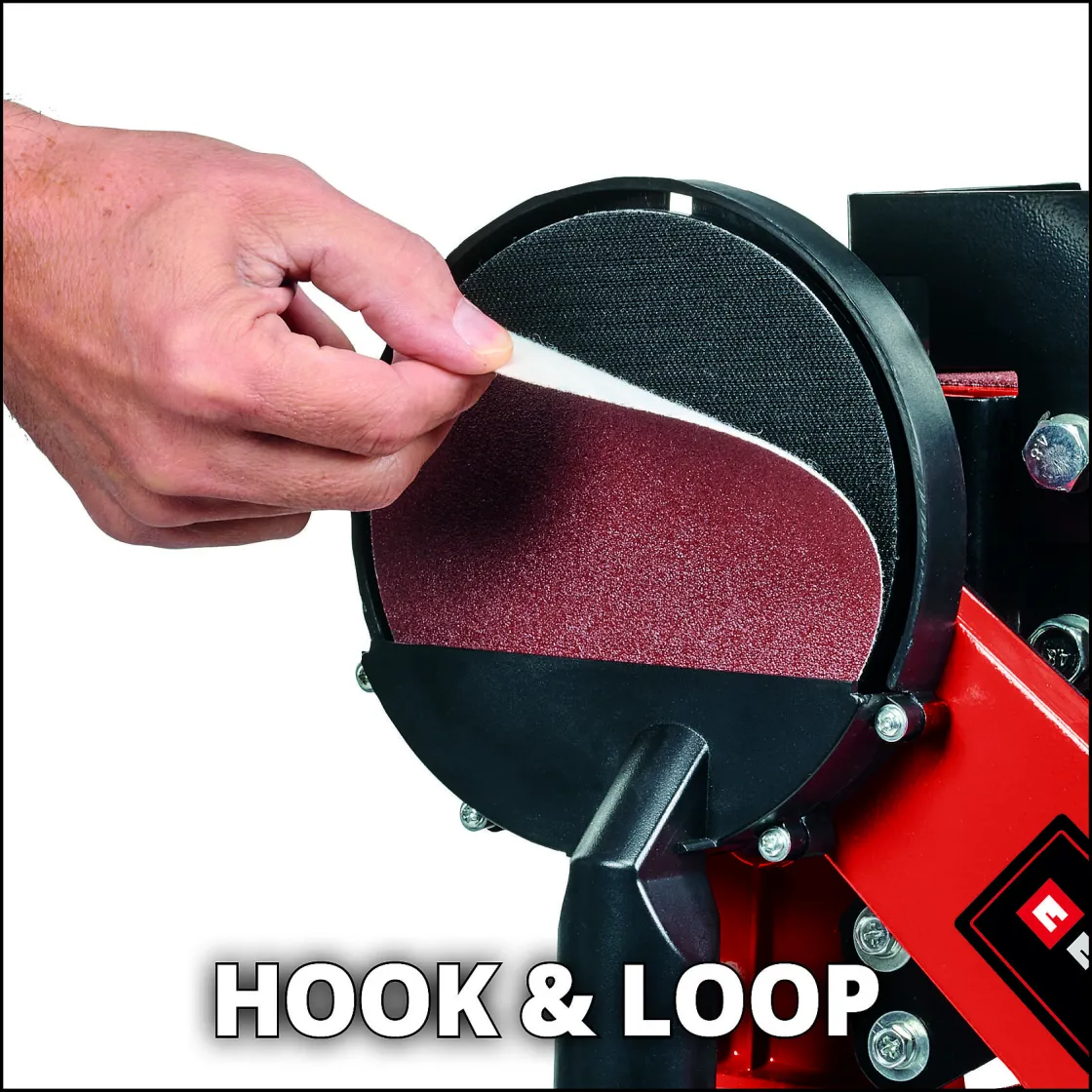 De Schijfschuurmachine Met Een Diameter Van 150 Mm Is Met Klittenbandbevestiging Uitgerust Voor Een Snelle Wissel Van De Schuurschijf. De Kantelbare Alu-Oplegtafel Is Stabiel En Buigvrij Vervaardigd, Bij De Bandschuurschijf Te Gebruiken En Met Een Makkelijk Afleesbare Hoekschaal Voor De Vele Gebruiksmogelijkheden Uitgerust.