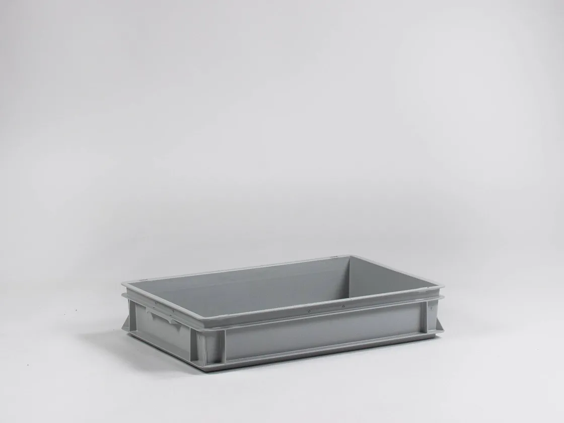 Grijze Kunststof Transport En Opslagbak Bak Van E-Line Met Gesloten Bodem, Wanden En Handgrepen. De Bak Heeft Een Inhoud Van 20 Liter, Met Buitenmaten Van 600X400X120 Millimeter En Binnenmaten Van 558X358X116 Millimeter.