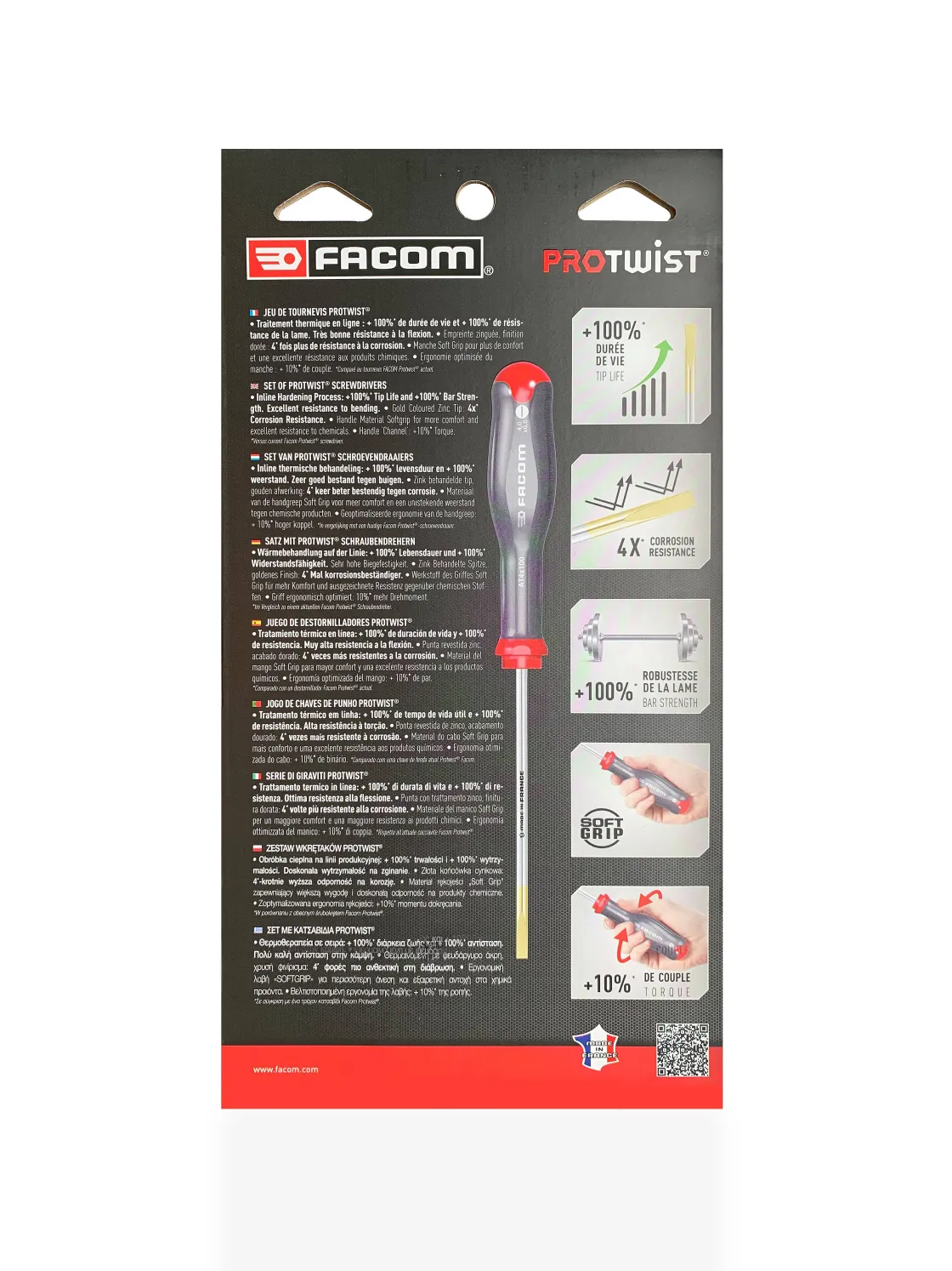 Facom Set Van 8 Protwist Schroevendraaiers. De Set Beschikt Over Vijf Platte Schroevendraaiers Met Afmeting Van 3,5 X 75 Mm, 4 X 100 Mm, 5,5 X 100 Mm, 6,5 X 150Mm En 8 X 150Mm . Daarnaast Ontvang Je 2 Pozidriv Schroevendraaiers Met Afmeting Pz 1X 100 Mm En Pz 2 X 125 Mm En Een Kruiskopschroevendraaier 0 X 75Mm. Alle Schroevendraaiers In Deze Set Beschikken Over Een Softgrip Handvat Voor Extra Comfort Tijdens Het Werken. De Schroevendraaiers Zijn Voorzien Van Een Kleurcode Voor Snelle Herkenning (Rood Is Plat, Geel Is Kruiskop En Blauw Is Kruiskop Met Pozidriv) De Set Wordt Geleverd Met Handig Kunststof Ophangrekje Om Al Je Schroevendraaiers Overzichtelijk In Op Te Hangen.