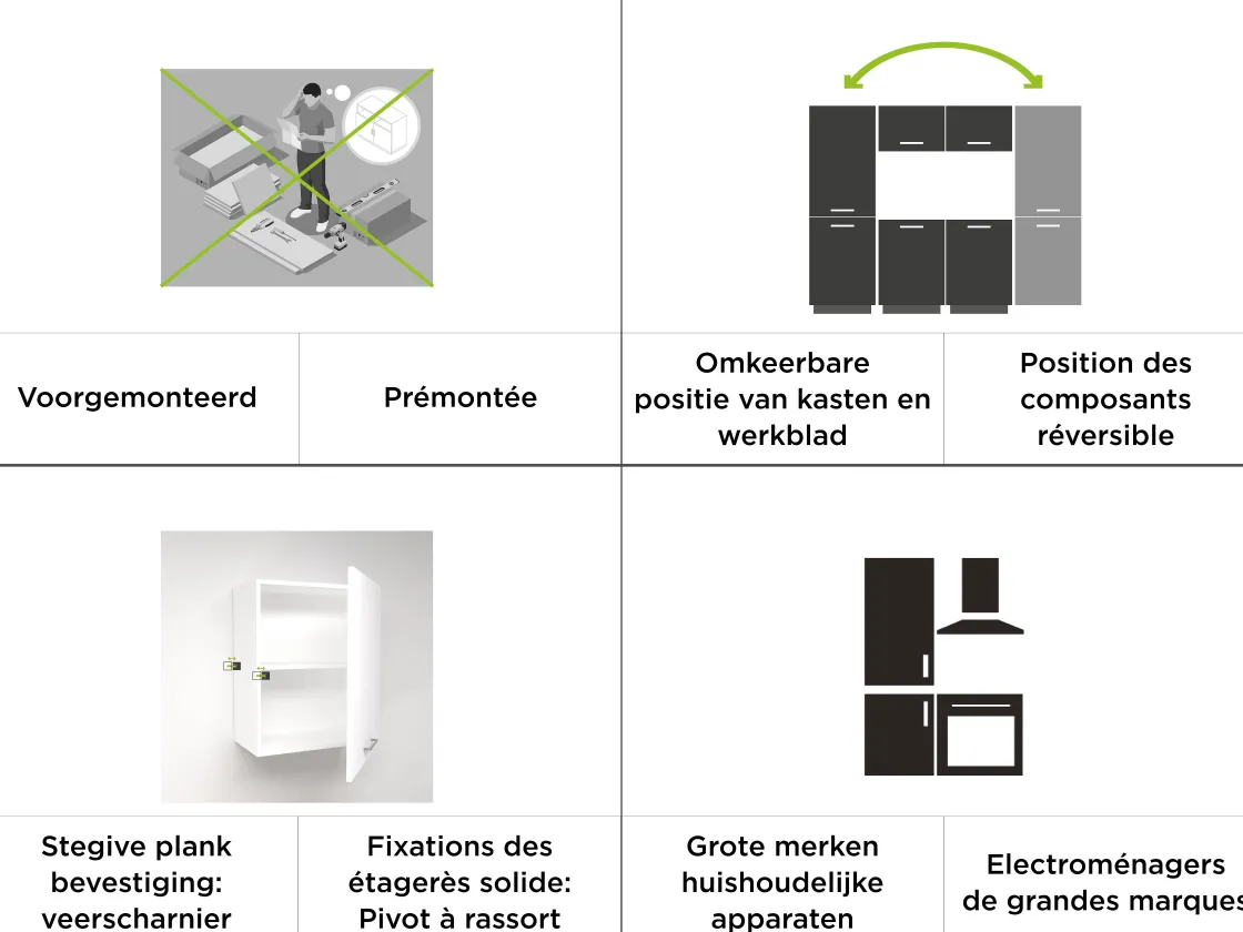 Dankzij De Vooraf Geintegreerde Apparaten Geeft Het Keukenblok Sofia Een Hoog Comfortniveau. De Grote Oven Met Een Kookruimte Van 75 Liter Is Ideaal Voor Al Je Bakrecepten. De Boodschappen Zijn Veilig Te Bewaren In De Grote Koel-Vriescombinatie Met 4-Sterren Vriesvak. De Moderne Afzuigkap Heeft Drie Standen En Zuigt Kookdampen Af Op Een Betrouwbare Manier. Je Hebt Vervolgens De Keuze Uit Meerdere Soorten Kookplaten (Apart Verkrijgbaar), Zoals Een Keramische, Inductie- Of Gaskookplaat. Het Werkblad Is Al Voorgeboord Voor De Kookplaat Die Het Beste Bij Jou Past!Flexibele Montagede Meubels Worden Vooraf Gemonteerd Geleverd, Zodat U Tijd En Extra Kosten Bespaart Tijdens De Montage. De Meubeldeuren Kunnen Zowel Links Als Rechts Worden Gemonteerd, Voor Maximale Flexibiliteit. De Hoogwaardige, Onderhoudsvriendelijke Fronten Van Melamine En De Stabiele Constructie Zorgen Ervoor Dat U Lang Van Uw Keuken Zult Genieten.Assemblage Flexibleles Meubles Sont Livres Premontes, Ce Qui Vous Permet D’Economiser Du Temps Et Des Couts Supplementaires Lors Du Montage. Les Portes Des Meubles Peuvent Etre Montees A Gauche Ou A Droite Pour Une Flexibilite Maximale. Les Facades En Melamine De Haute Qualite Sont Faciles A Entretenir. Cette Construction Stable, Vous Permet De Profiter Longtemps De Votre Cuisine.