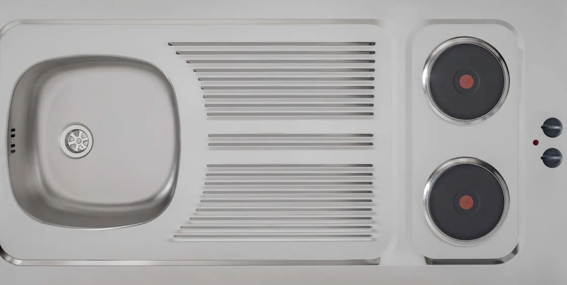 Deze Kitchenette Bestaat Uit Een Aanrecht En Twee Ingebouwde Kookplaten ( 2X 1500 Watt) En Is Daarmee Ideaal Voor De Kleine Keukens. Het Aanrecht Is Zowel Rechts Als Links Omkeerbaar En Voorzien Van Een Afvoer Met Plug, Sifon, Overloop En (Vaat)Wasmachine Aansluiting.