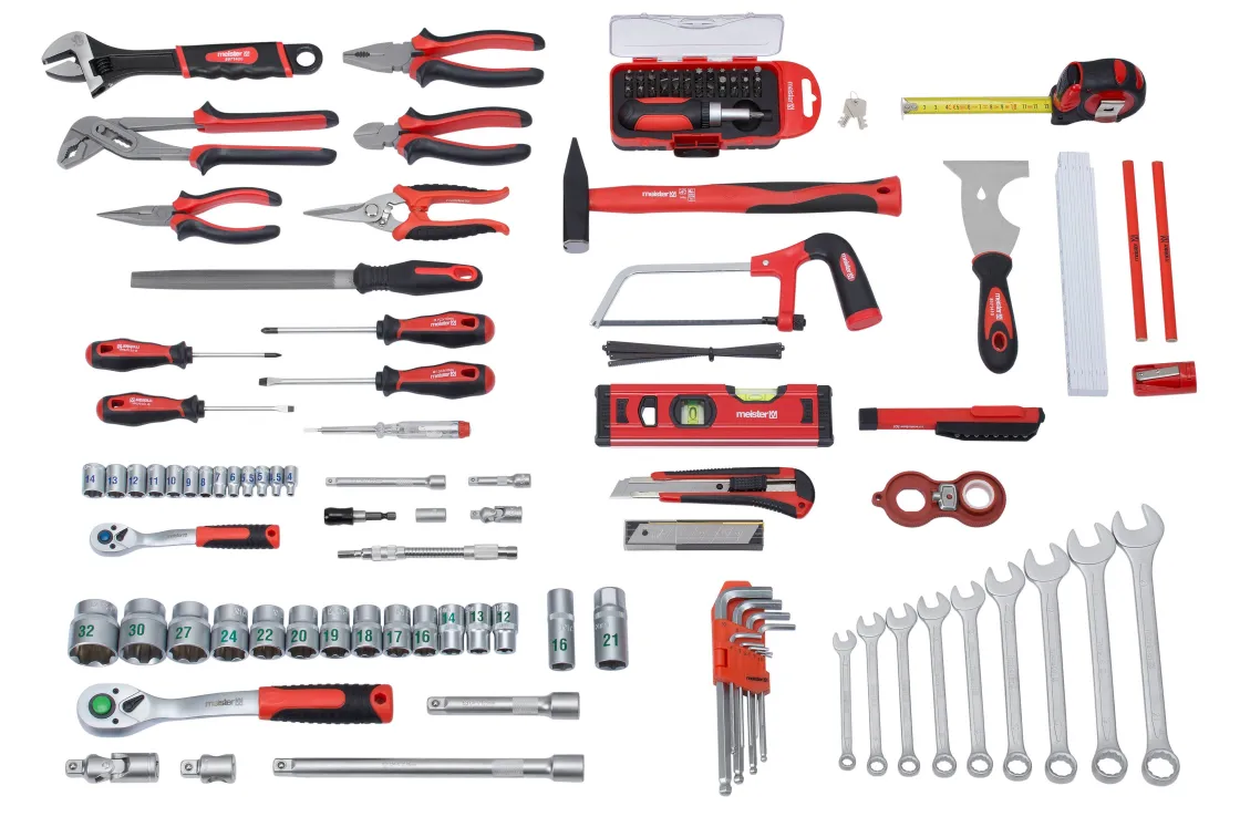 1X Waterpomptang 240 Mm, 1X Combinatietang 180 Mm, 1X Zijsnijder 160 Mm, 1X Punttang 160 Mm, 1X Universele Schaar, 1X Steeksleutel 250 Mm, 9X Steeksleutel: 8 – 10 – 11 – 12 – 13 – 15 – 17 – 19 – 21 Mm, 1X Halfronde Vijl 200 Mm, 1X Monteurshamer 300 Gr Met Glasvezel Handvat, 1X Meetlint 5 M, 1X Duimstok 2 M, 1X Waterpas 200 Mm, 1X Multifunctionele Spatel 5-In-1, 1X Led Penlight, 2X Timmermanspotlood, 1X Puntenslijper Voor Timmermanspotlood, 9X Pinsleutel: 1,5 – 2 – 2,5 – 3 – 4 – 5 – 6 – 8 – 10 Mm, 1X 4-In-1 Straalregelaar Moersleutel, 1X 180 Mm Afbreekmes, 6X Reservemesjes Voor Afbreekmessen( “Made In Germany” By Lutz), 1X Mini Zaag 150 Mm, 5X Reservemessen Voor Mini-Zaag: 3X Hout, 2X Metaal ( “Made In Germany” By Puk), 4X Schroevendraaier: Pozidriv; Pz1 X 75 Mm – Pz2 X 100 Mm En Gegroefd; 5,5 X 75 Mm – 6,5 X 100 Mm, 1X Spanningstester 125 – 250 V, 1X Ratel Schroevendraaier, 2X Adapter, 36X Bit: Gleuf; 3,0 – 4,0 – 5,0 – 6,0 – 7,0 Mm, Phillips; Ph0 (2X) – Ph1 (2X) – Ph2 (2X) – Ph3, Pozidriv; Pz0 (2 Stuks) – Pz1 (2 Stuks) – Pz2 (2 Stuks) – Pz3 (2 Stuks), Torx; T10 – T15 – T20 – T25 – T30 – T40, Zeskant: 2,0 – 2,5 – 3,0 – 4,0 – 5,0 – 5,5 – 6,0 Mm En Vierkant; 0 – 1 – 2, 1X Snelwisselbithouder 6.35Mm (1/4″), 1X Flexibel Verlengstuk Voor Bits 150 Mm, 1X Omkeerbare Ratel 12,7 Mm (1/2″), 13X Dop 12,7 Mm (1/2″);12 – 13 – 14 – 16 – 17 – 18 – 19 – 20 – 22 – 24 – 27 – 30 – 32 Mm, 2X Bougiedop 12,7 Mm (1/2″); 16 – 21 Mm, 2X Verlenging 12,7 Mm (1/2″); 125 – 250 Mm, 1X Kruiskoppeling 12,7 Mm (1/2″), 74 Mm, 1X T-Greep Adapter 12,7 Mm (1/2″) , 28 Mm, 1X Omkeerbare Ratel 6,35 Mm (1/4″), 13 X Dop 6,35 Mm (1/4″); 4 – 4,5 – 5 – 5,5 – 6 – 7 – 8 – 9 – 10 – 11 – 12 – 13 – 14 Mm, 2X Verlengstuk 6,35 Mm (1/4″); 55 – 100 Mm En 1X Kruiskoppeling 6,35 Mm (1/4″), 39 Mm.