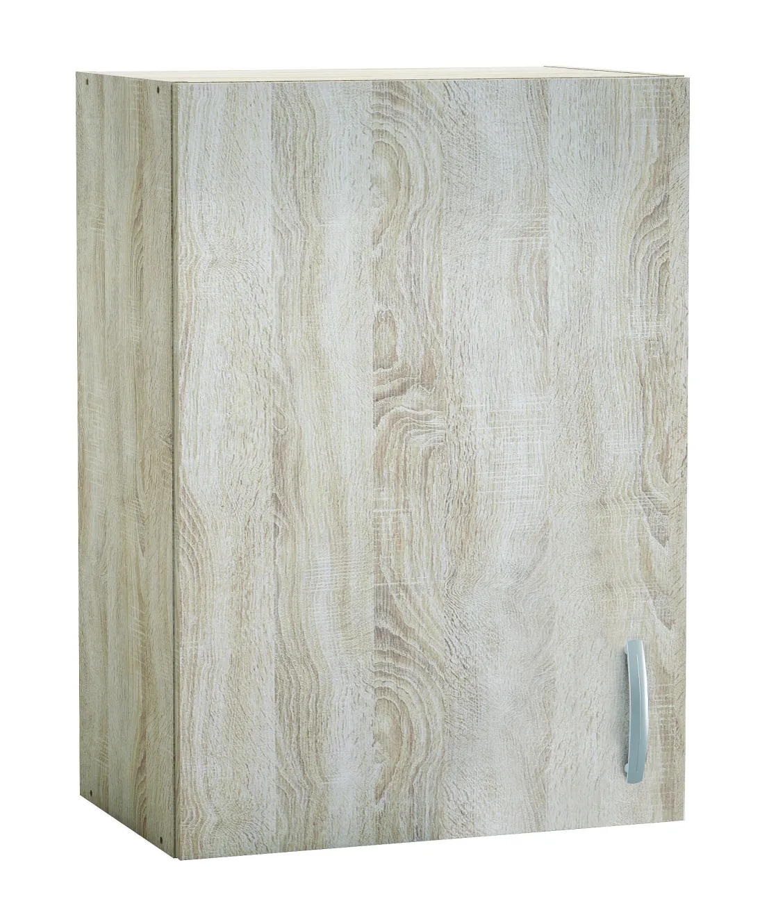 Hoge Kast Met 1 Deur Van Geborsteld Eiken Melamine. 1 Verstelbare Plank, Nuttige Afmetingen: 46,8 X 27 Cm. Grijs Gelakt Handvat, Hartafstand 12,8 Cm.