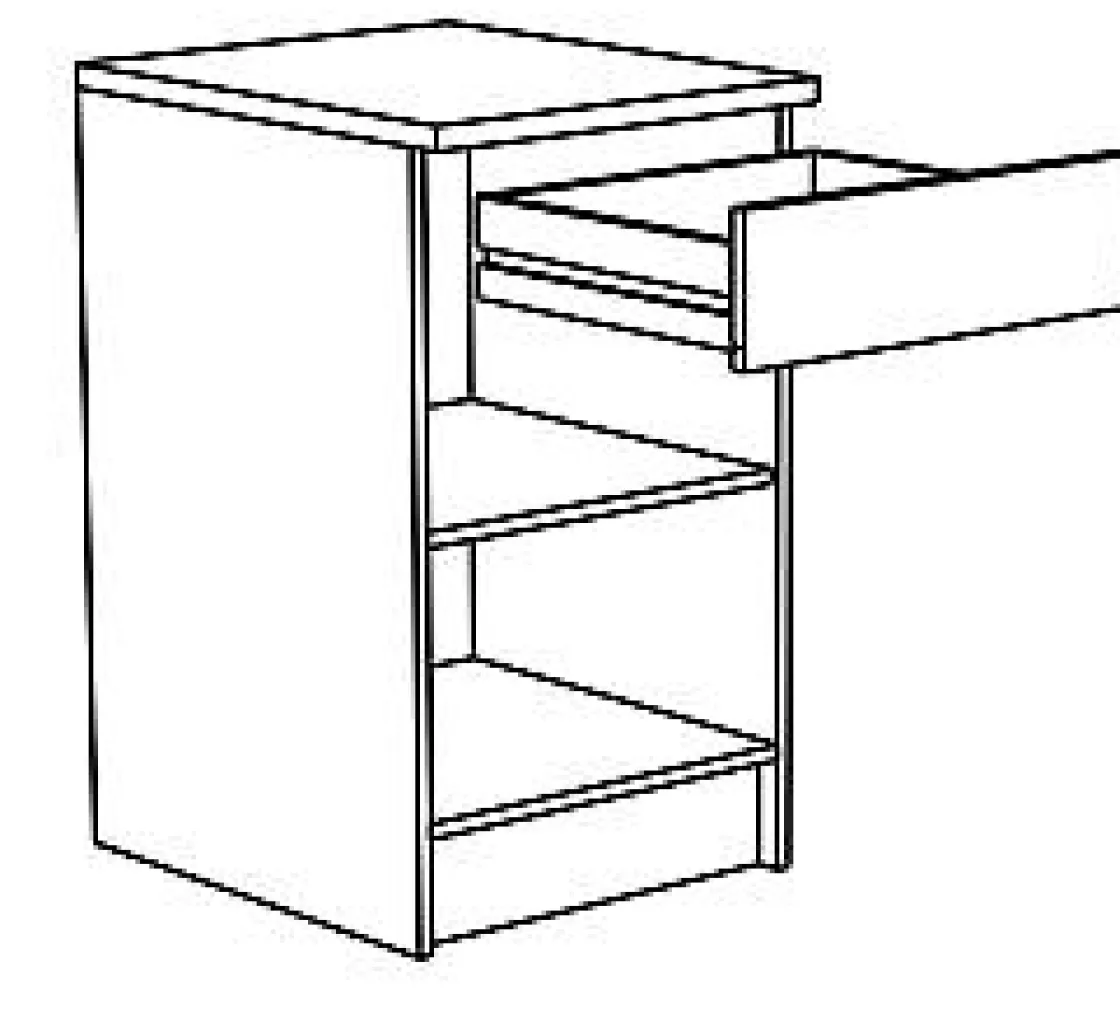 Onderkast Met 1 Deur En 1 Lade, In Geborsteld Eiken Melamine. Diepte 60 Cm. 1 Legplank Verstelbaar Op 3 Niveaus, Nuttige Afmetingen: 57X50 Cm. 1 Lade Gemonteerd Op Rolwieltjes, Nuttige Afmetingen: 38X9X52 Cm. Sanitaire Ruimte Van 5 Cm.