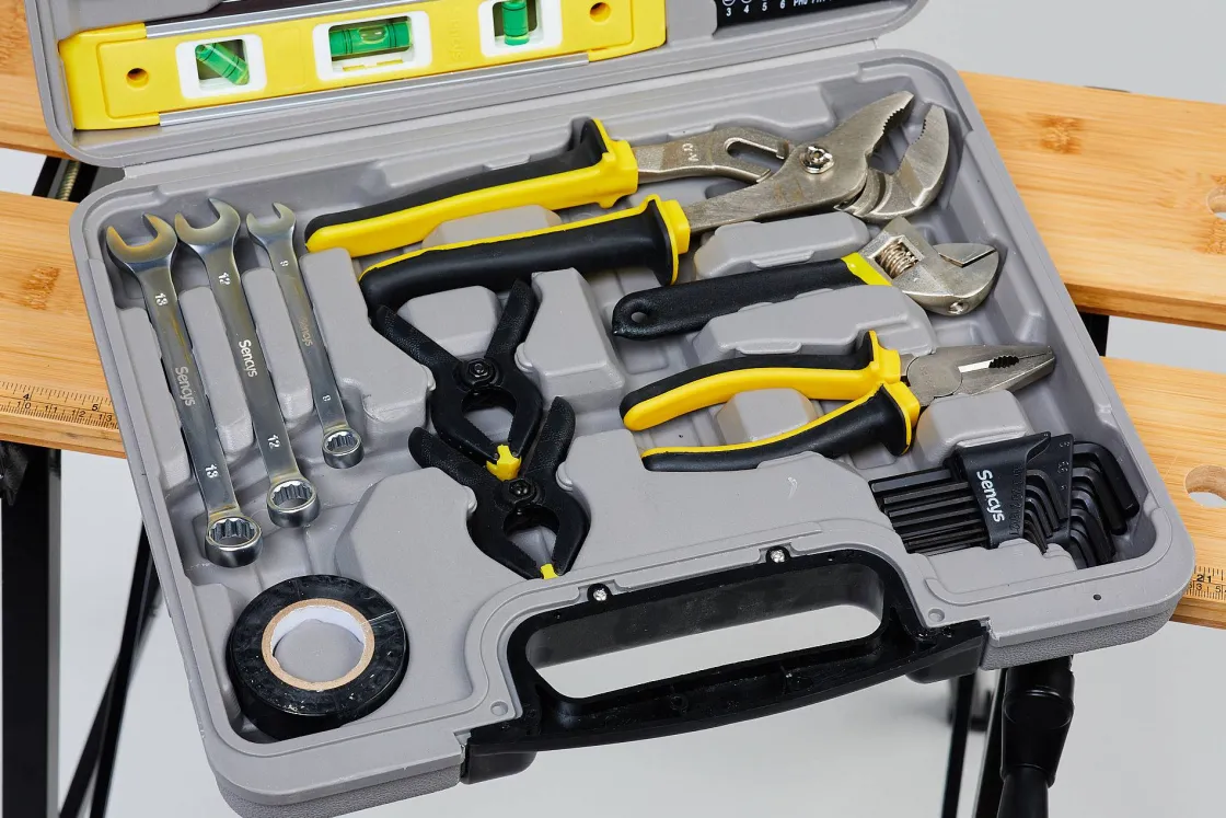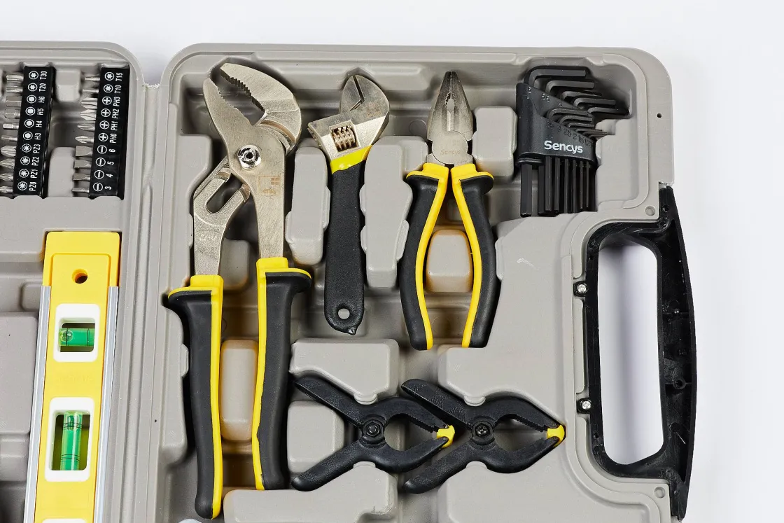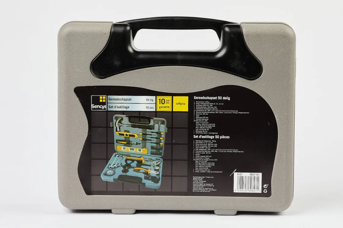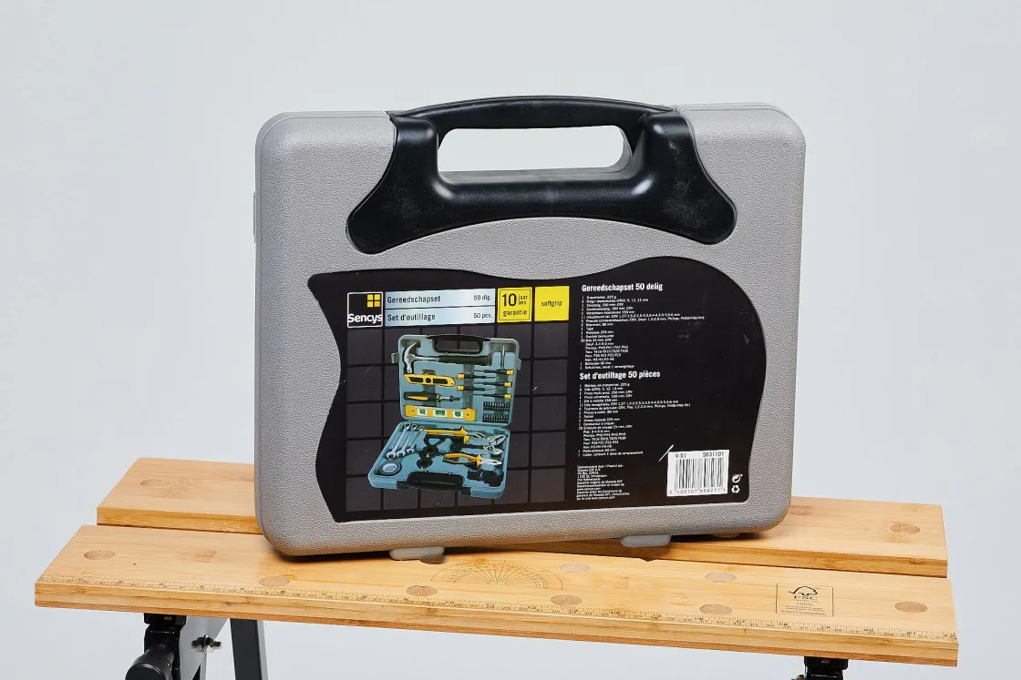 Deze Gereedschapskoffer Van Sencys Beschikt Over 50 Accessoires, Zijnde: 1 X Klauwhamer, 3 X Ringsleutels, 1 X Waterpomptang, 1 X Combinatietang, 1 X Verstelbare Ringsleutel, 11 Verschillende Inbussleutels, 5 Verschillende Precisie Schroevendraaiers, 2 X Veerklemmen, 1 X Rol Plakband, 1 X Waterpas, 1 X Ratelsleutel, 20 Verschillende Schroevendraaier Bits, 1 X Bithouder En 1 X Mesje.