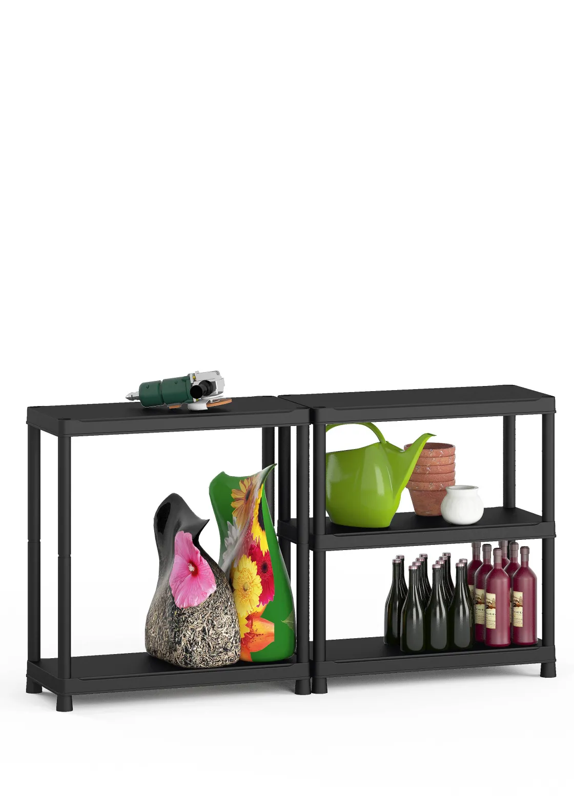 Rek In Polypropyleen (Pvc), Makkelijk Te Monteren Zonder Gereedschap. Beschikt Over 5 Planken En Kan Gebruikt Worden Als Rek Of Als Werktafel Van 180Cm Lang. Bevestiging Aan De Muur Is Mogelijk.