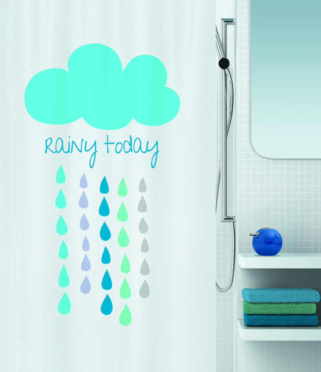 Het Douchegordijn Cloud Met De Tekst ‘Rainy Today’ Van Spirella Is 180 Cm Breed, Gemaakt Van Polyester En Voorzien Van Gaten Voor De Doucheringen.
