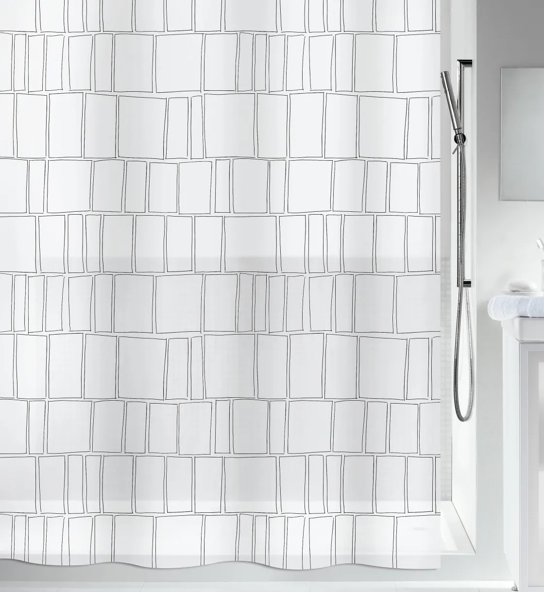 Het Douchegordijn Construct Van Spirella Is 180 Cm Breed, Waterafstotend En Gemaakt Van Plastic. Het Gordijn Is Voorzien Van Gestikte Boorden En Gaten Voor De Doucheringen.