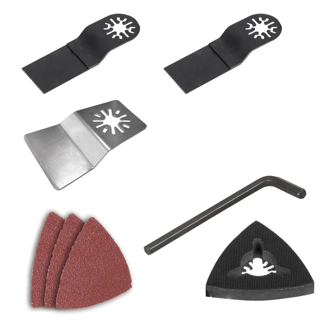 Inhoud Van De Set: 3 X Schuurpapier, Schuurvoet, 2 Zaagbladen En Schraapmes.