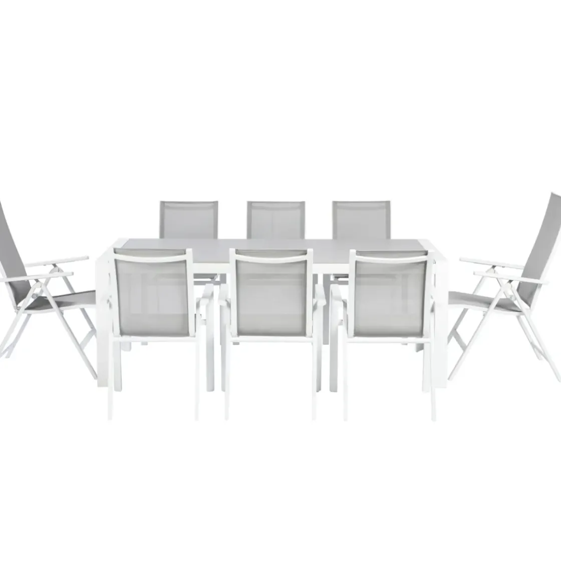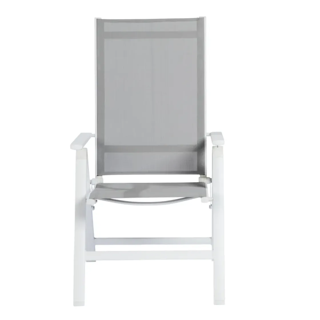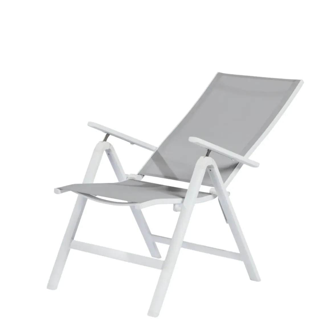 Tuinstoel Anzio Van Central Park Is Een Verstelbare Tuinstoel (7-Standen) Met Een Wit Aluminium Frame En Lichtgrijs Zit- En Rugvlak.
