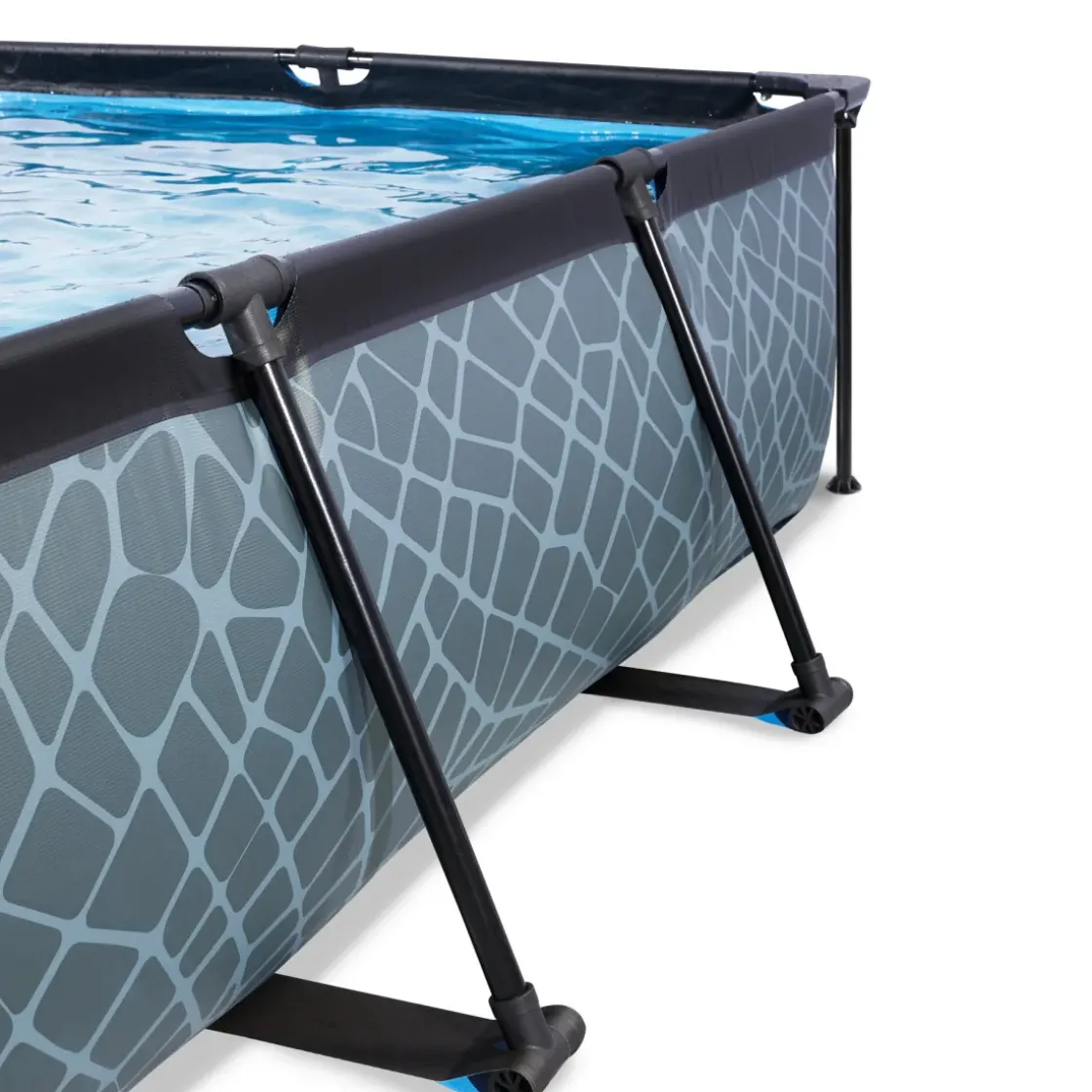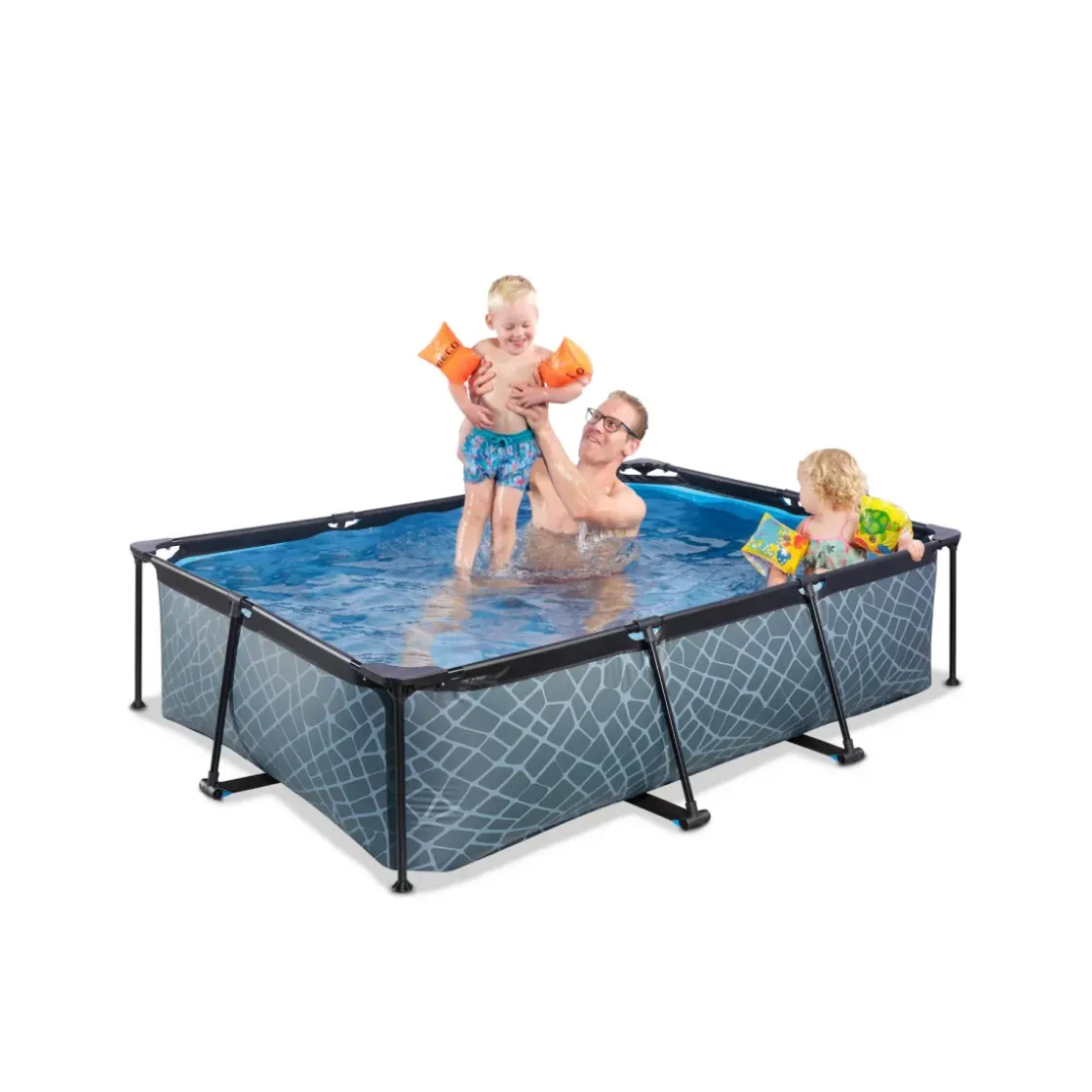 Het Exit Stone Zwembad 220 X 150 X 65 Cm Is Een Rechthoekig, Grijskleurig Frame Zwembad. Dit Compacte Zwembad Is Standaard Voorzien Van Een Filterpomp En Valt Op Tussen Andere Baden Door Zijn Stoere Steenpatroon. Ontdek Hoe Stevig Een Rechthoekig Opzetzwembad Kan Zijn: Het Gepoedercoate Stalen Frame En De Sterke Hoekpunten Van Het Exit Stone Zwembad Zorgen Ervoor Dat Het Bad Altijd Stabiel Staat En Jarenlang Meegaat. De Meegeleverde Filterpomp Houdt Het Water Schoon En In Beweging Zodat Vervuiling Van Het Water Wordt Tegengegaan.
