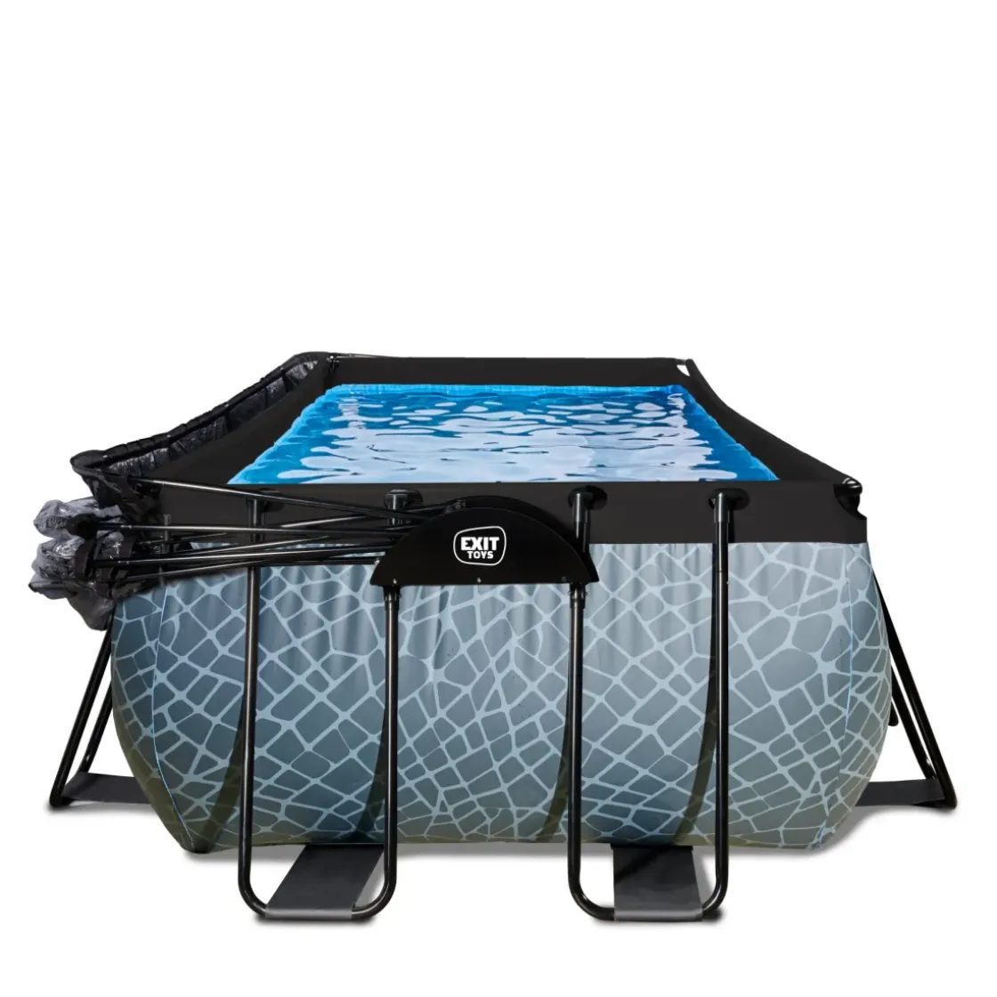 Het Exit Stone Zwembad 400 X 200 X 100 Cm Is Een Rechthoekig Grijskleurig Frame Zwembad Met Overkapping. Het Zwembad Is Standaard Voorzien Van Een Zandfilterpomp, Warmtepomp En Een Zwembadtrap, Waarmee Je Veilig Het Zwembad In En Uit Kunt Stappen. Het Stone Zwembad Heeft Een Modern En Stoer Steenpatroon Op De Zijkant En Is Daarmee Een Echte Blikvanger In De Tuin. Het Exit Zwembad Is Uitgevoerd Met Sterke 3-Laags Wanden Van Pvc En Polyester En De Binnenzijde Van Het Zwembad Is Blauw, Voor Het Frisse Zwembadgevoel.